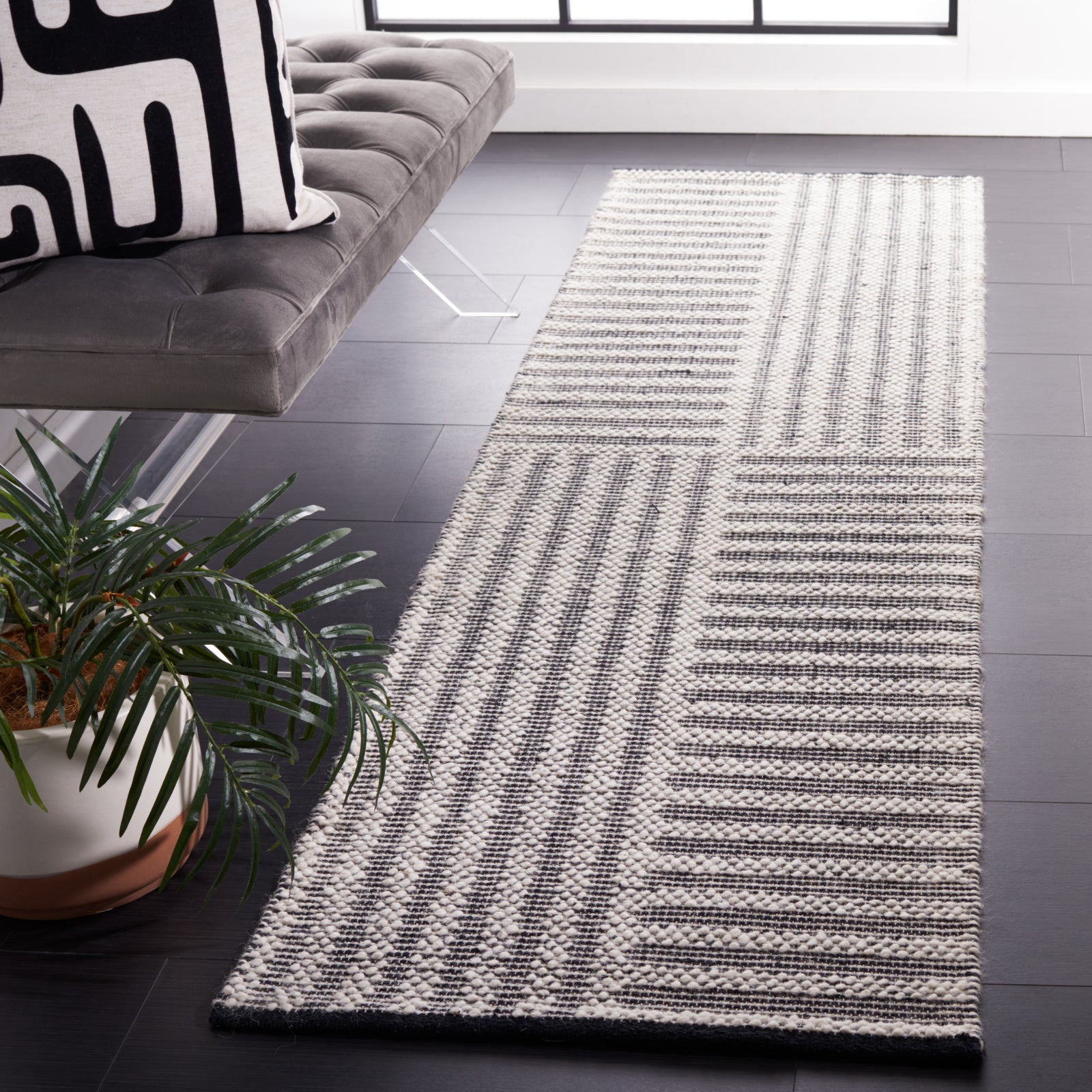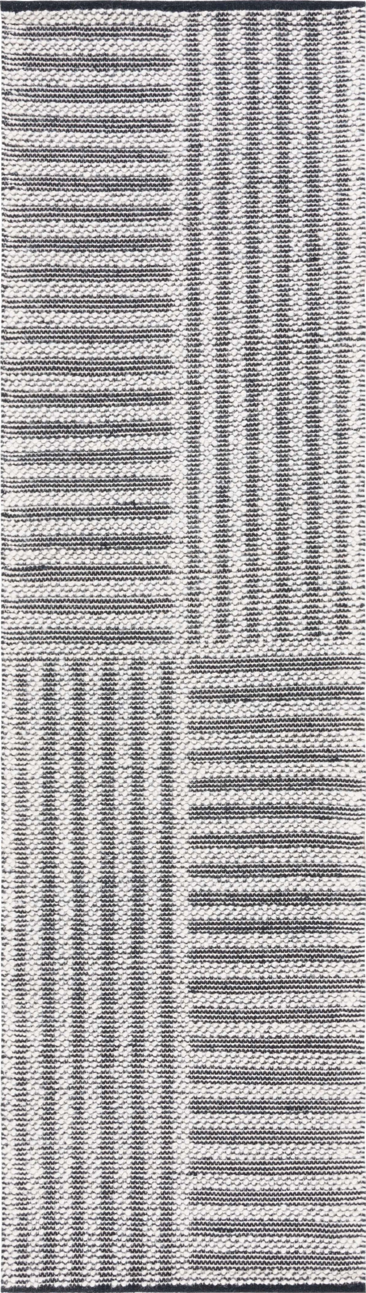 Elevate your home with the understated elegance of our handwoven Modern Ivory/Black Runner Rug. Skillfully crafted in India with a blend of 60% wool and 40% cotton, this luxurious rug combines durability with softness, providing a comfortable underfoot experience with every step. Perfect for long hallways or narrow spaces, the rug measures a convenient 2 feet 3 inches by 8 feet, with a comfortable pile height of 3/8 inch.