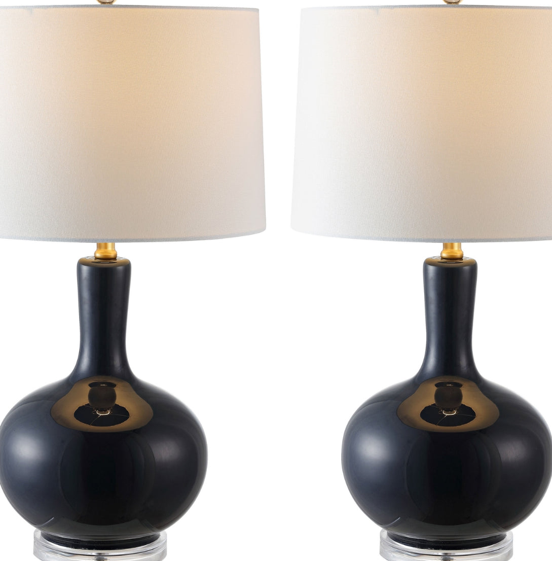 Bring modern magic to any contemporary interior with this stunning table lamp. Designed with a luxurious navy hue that illuminates its sleek glass curves, it sits on an acrylic base and is topped with a matching finial and white shade. Sold in sets of two.