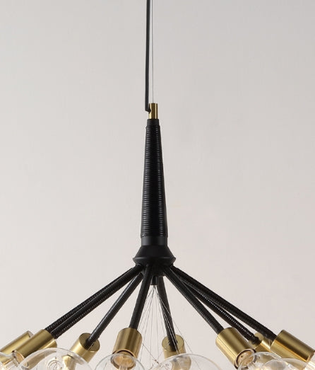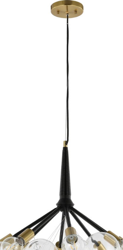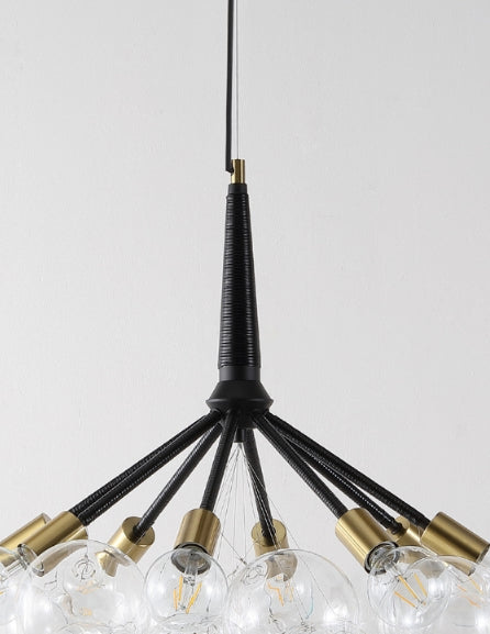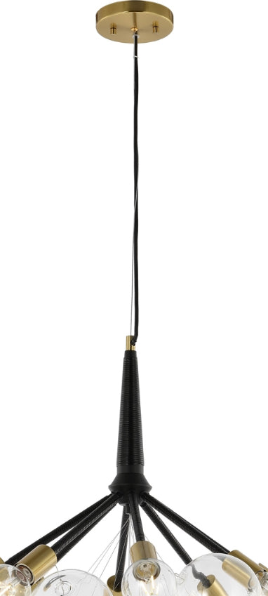 Add an artful and radiant focal point to your space with our stunning Novellia chandelier. Showcasing a stunning play of forms, materials, and finishes, our chandelier serves as an elevated and eye-catching addition. Its slender radiating arms create a beautiful cluster of spherical shades. Vouching for a sculptural presence, our chandelier remains a true stunner. It is accented with black leather and gleaming brass hardware for added drama and elegance. Casting a warm and inviting glow upon the clear glass shades, our chandelier creates a dramatic ambience in your entryway, dining, or living space.