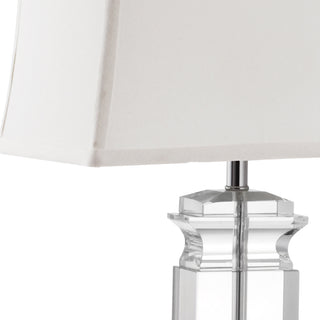Romantic and feminine, the harp shaped crystal base of the Olympia Table Lamp clearly adds sparkle to living room end tables and bedroom nightstands. With silver stand and fittings, and rectangular shade in linen weave white cotton, this Olympia sets an elegant mood in room decor.'sold in sets of two.
