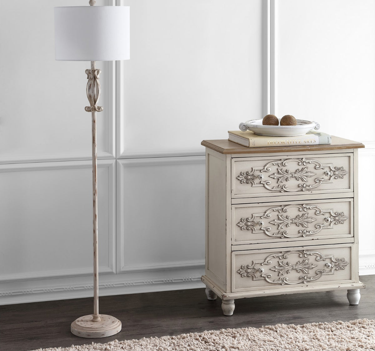 Bring the charm and romance of modern rustic style to the living room or bedroom with this traditional floor lamp. Crafted with a 100% cotton shade and metal body, its beautiful white washed finish completes its antique essence.