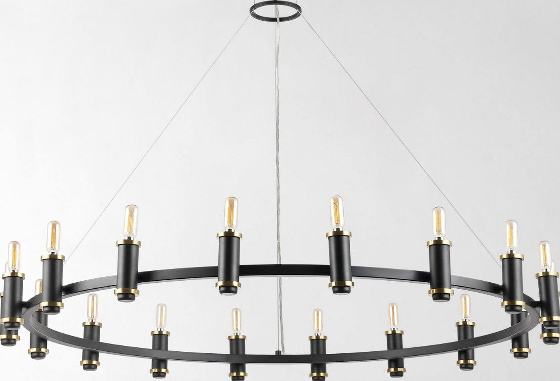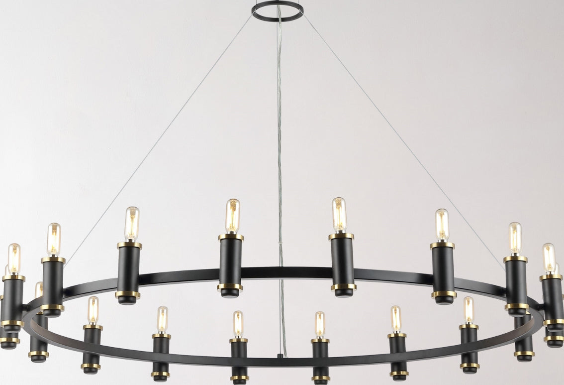 Make a sleek and sophisticated statement overhead with our Poitier chandelier. Refining a classic chandelier to its essentials, our ceiling light transforms any room with its clean and chic presence. An oversized black metallic ring sets the minimalist tone of our chandelier. It is complemented with slender metallic holders and bulbs to achieve a sleek and modern look. Casting a warm and inviting glow, our chandelier illuminated your entryway, dining space, or living area with its refined charm and elegance.
