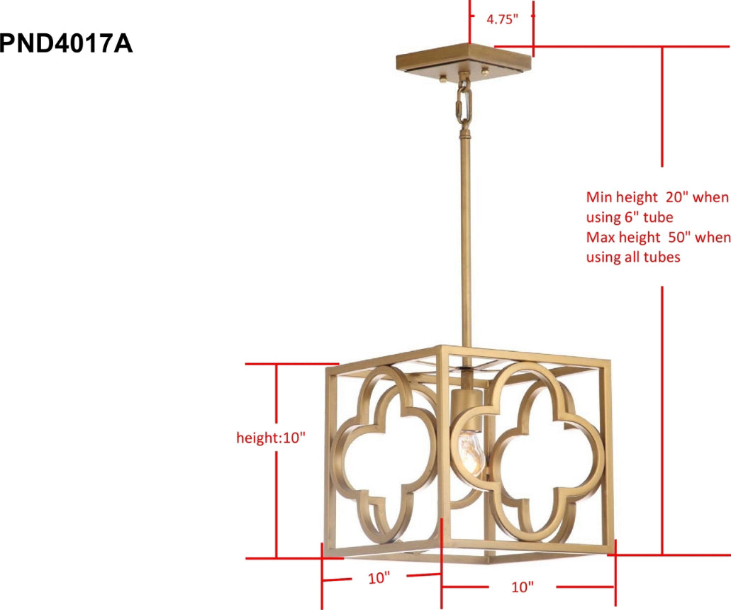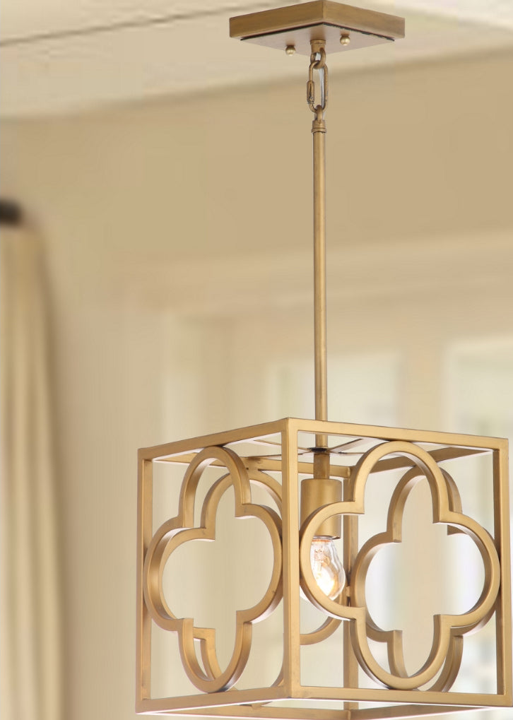 Bring glamour and sophistication to your decor with this contemporary trellis pendant. Designed with a bold metal frame, it features a decadent gold finish and quatrefoil cut out that makes a grand statement in any foyer, living room or dining room.