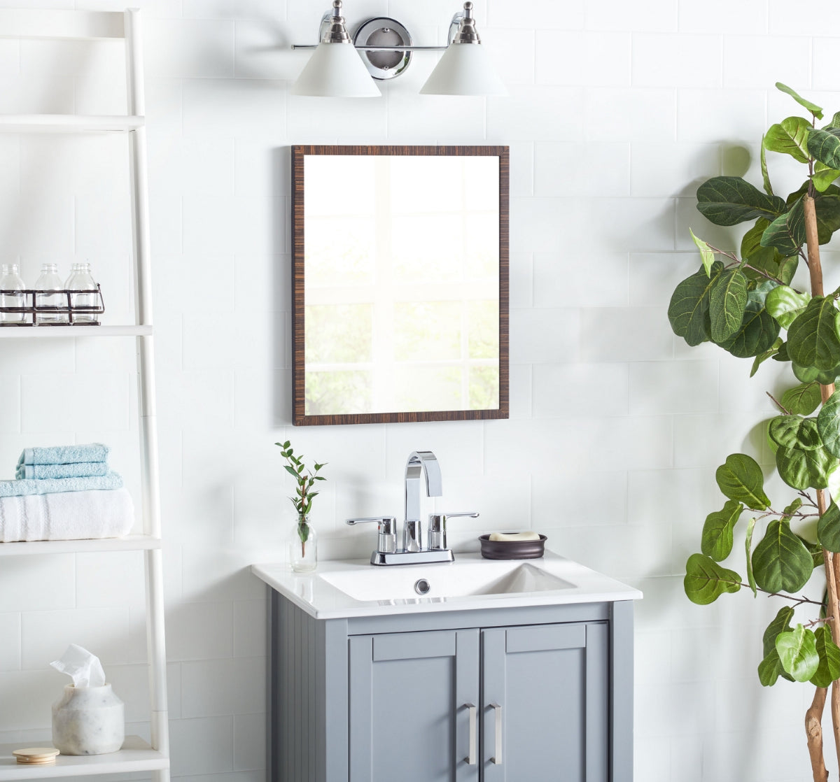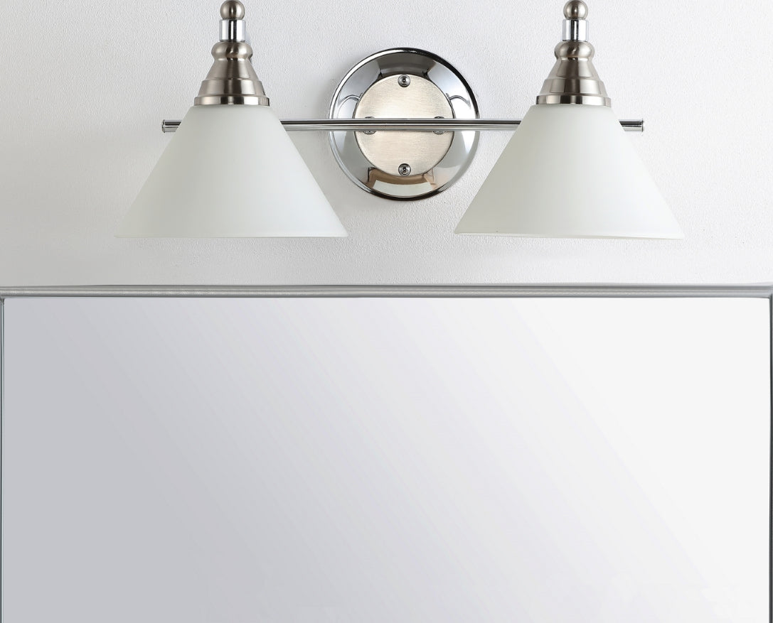 Design your own modern refuge with this contemporary Radnor Two Light Wall Sconce. A new spin on classic bathroom lighting, its polished nickel finish blend seamlessly with any style. Radnor's sleek white glass shades create a gentle, warm glow.
