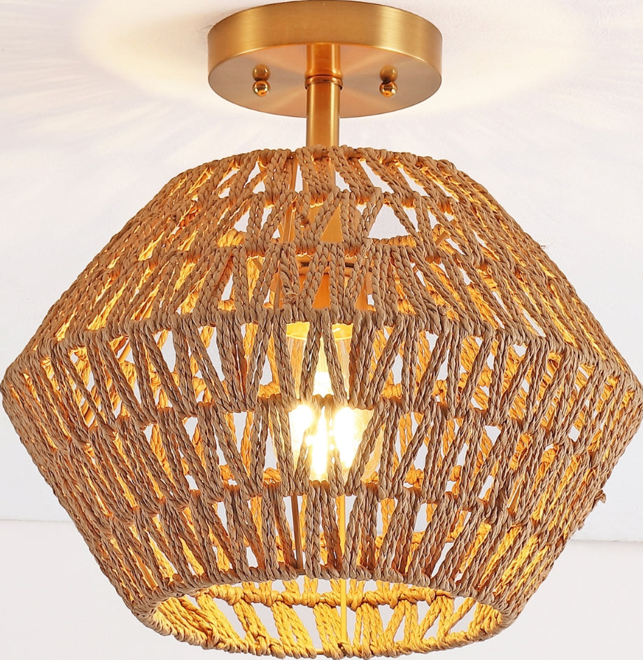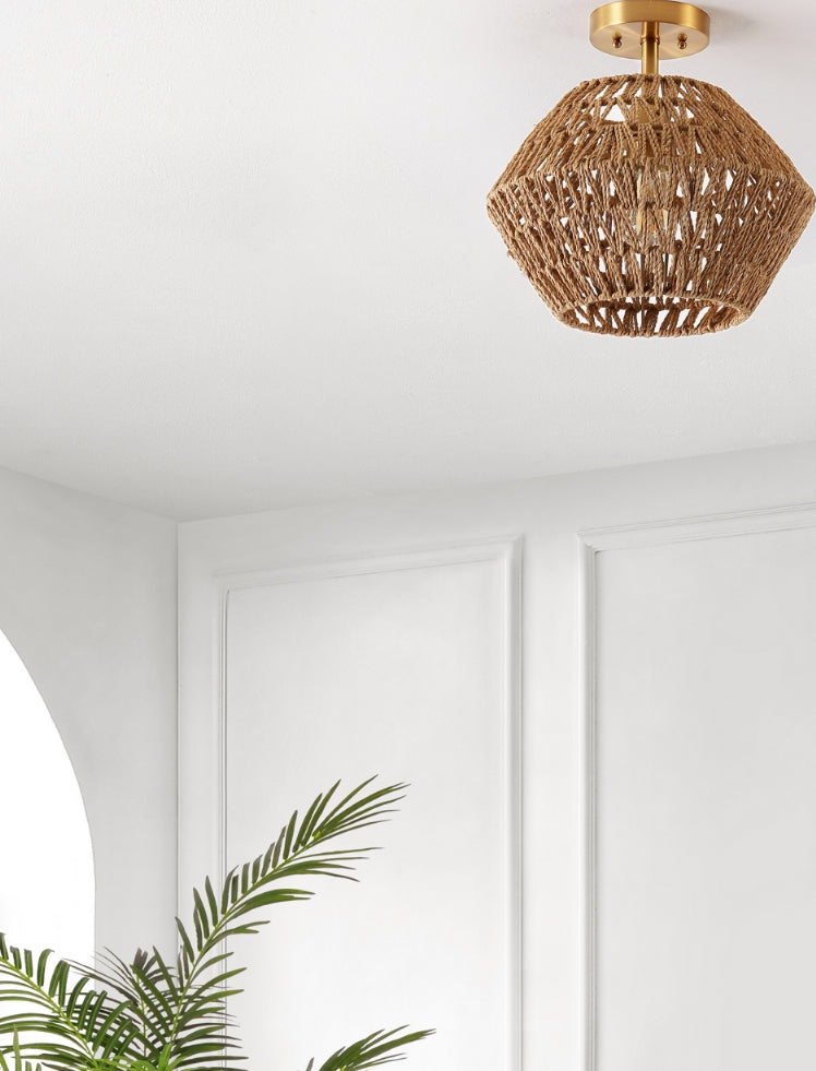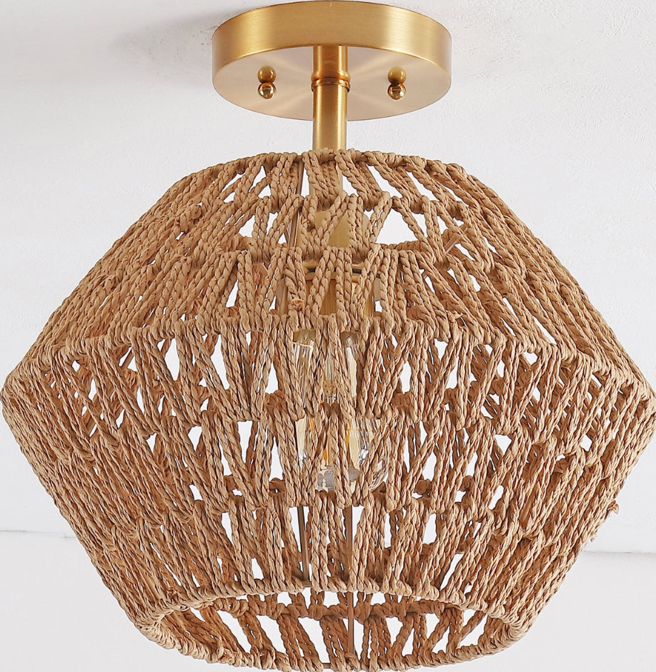 Enliven your home with the modern and breezy presence of our Raja flush mount. A sleek geometric shade is updated with an airy, open weave to offer a stunning artisanal appeal. Complemented with gold hardware, our flush mount remains the perfect blend of refined style and rich textures. It diffuses ambient light, creating a stunning play of light and shadow to brighten up your kitchen, bathroom, dining area, or bedroom.