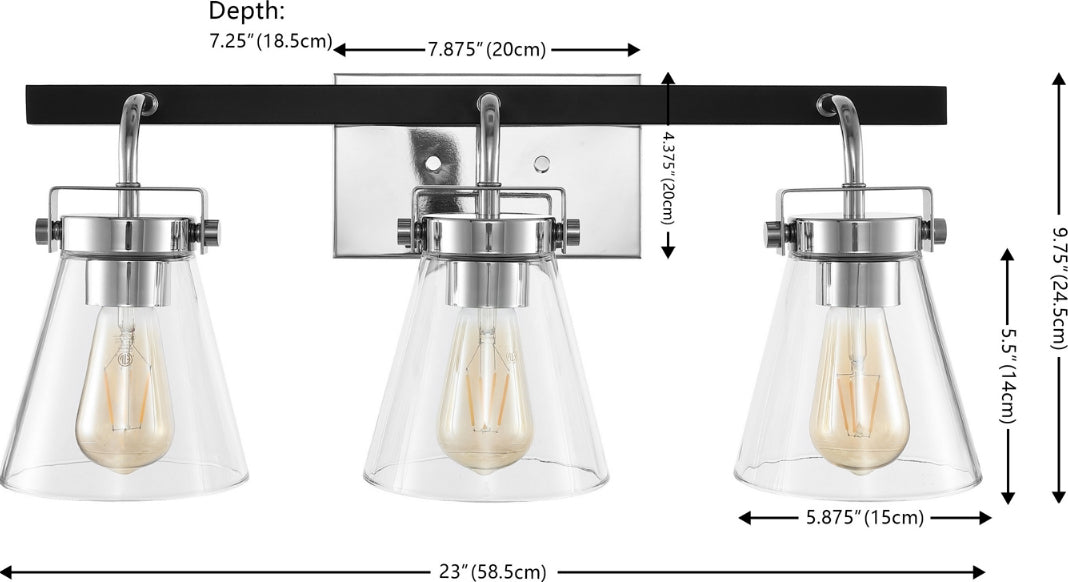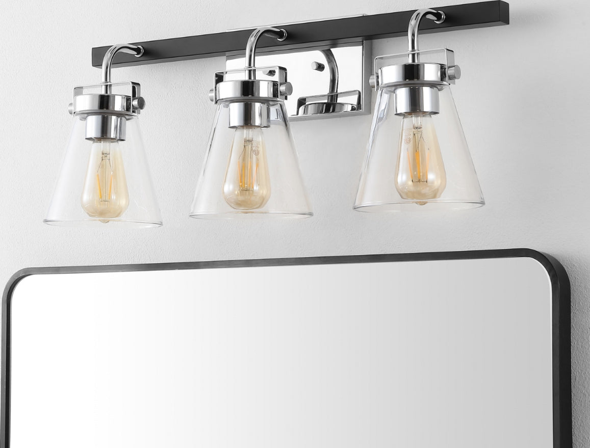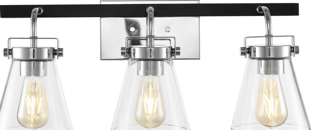 Elevate your home with the luxe and sophisticated presence of our Rayney wall sconce. Our mid-century-inspired wall sconce makes an impact with its sleek geometry and rich finishes. Its gracefully arching arms hold three stunning conical glass shades. Featuring a stunning mix of gleaming chrome and black metallic finish, the wall sconce adds the perfect touch of polish to your home. Its glass shades expose vintage-style bulbs to create a warm and pleasant glow. A chic and sophisticated addition, our triple wall sconce remains perfect for brightening up your hallway, bathroom, or entryway.