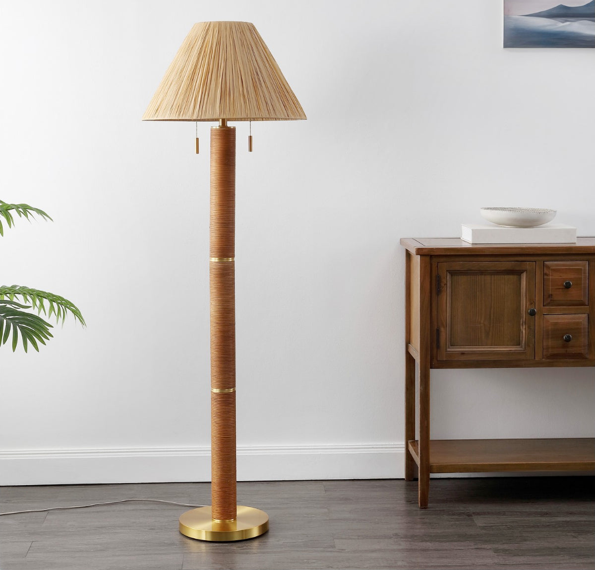 Whether you're looking to add a functional lighting element to your living room or seeking a decorative piece to enhance your interior design, the RAYVI Floor Lamp is a smart choice. The combination of its natural and gold tones will seamlessly blend with various color palettes, making it a versatile addition to your home or office.