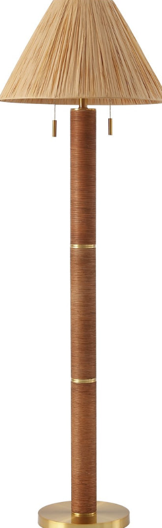 Introducing the RAYVI Floor Lamp, where elegance meets practical design. This striking floor lamp combines the warmth of natural materials with a touch of metallic sophistication. The body, crafted from a blend of metal and rattan, offers a durable and visually interesting structure that stands on a stable gold-colored base.