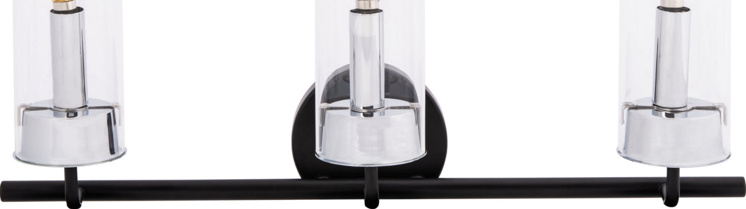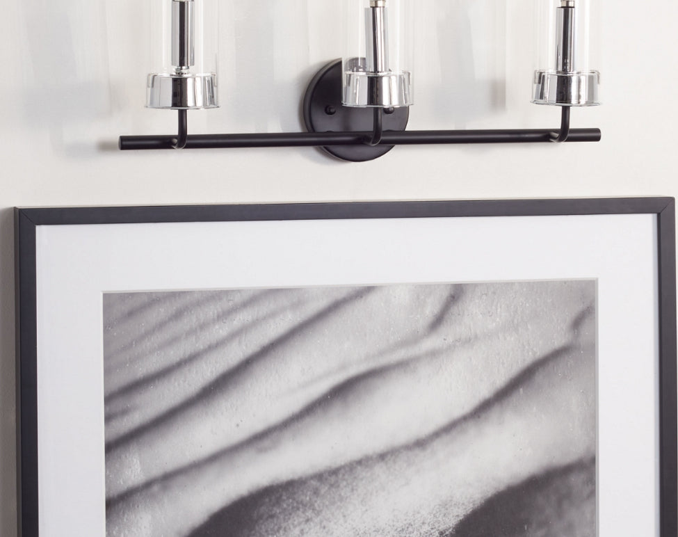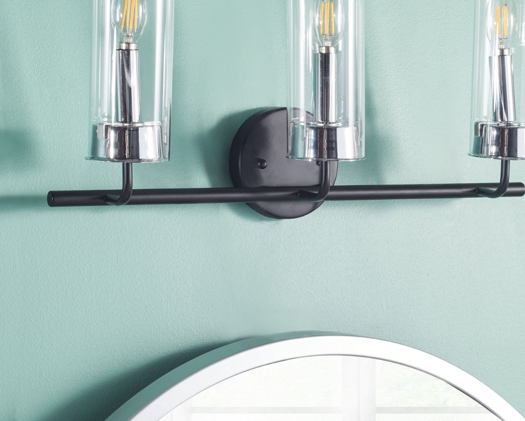 A contemporary update of the classic hurricane lamp, this Remery Vanity Sconce sheds soft light into any interior. Remery's matte black frame dramatically juxtaposes with its nickel finished chrome bases, beautifully holding aloft three candle inspired lights for a touch of timeless charm.