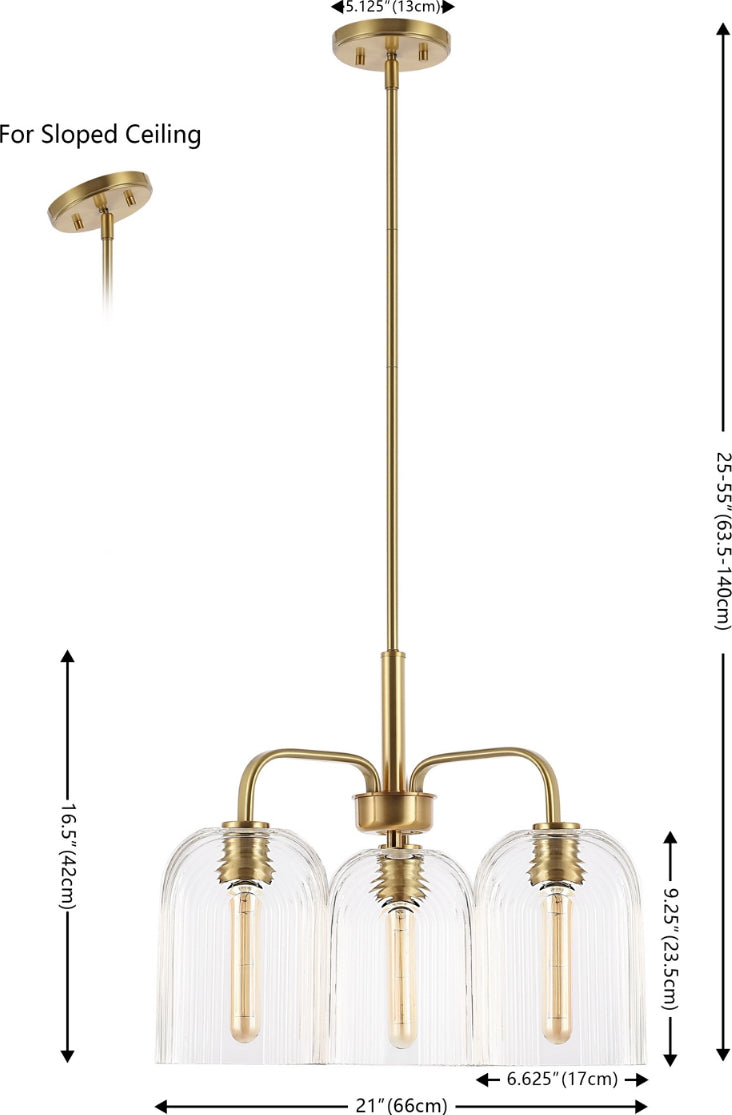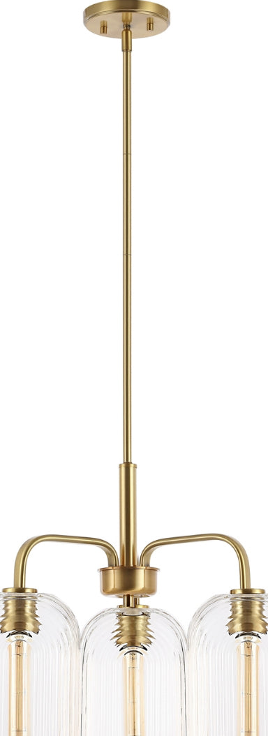 Bring luxe elegance to your home with our stunning Romeyn pendant. The refined design and sophisticated details of our pendant lend a polished and elegant touch to any room. Its streamlined arms gracefully hold three stunning glass shades. A gorgeous ribbed detail follows the sleek curves and minimalist line of the glass shades to make an impact. Offering a stunning display of Edison-style bulbs, the pendant delivers a bright ambient glow. It is accented with brass to instantly glam up your entryway, dining area, or living space.