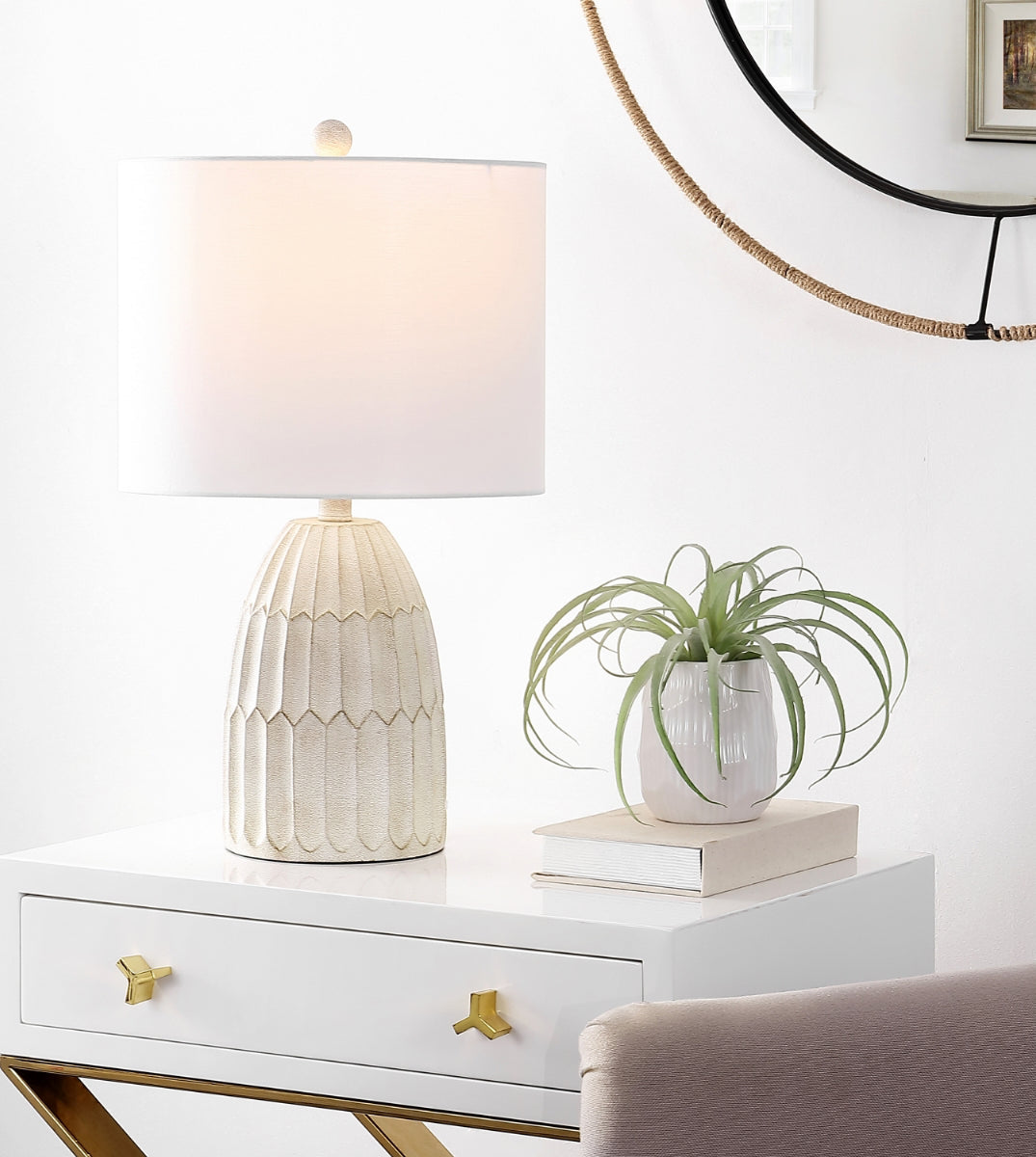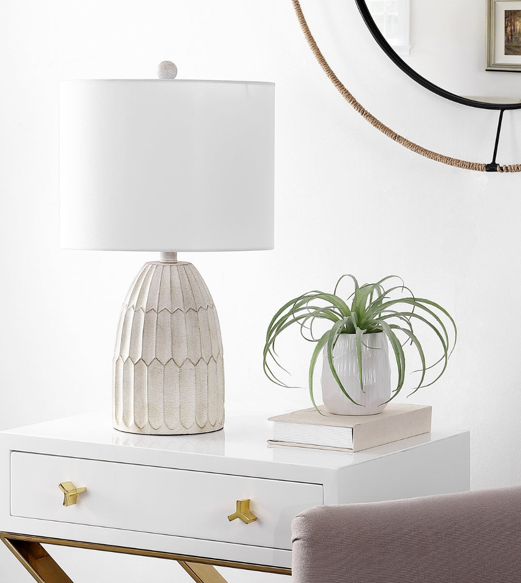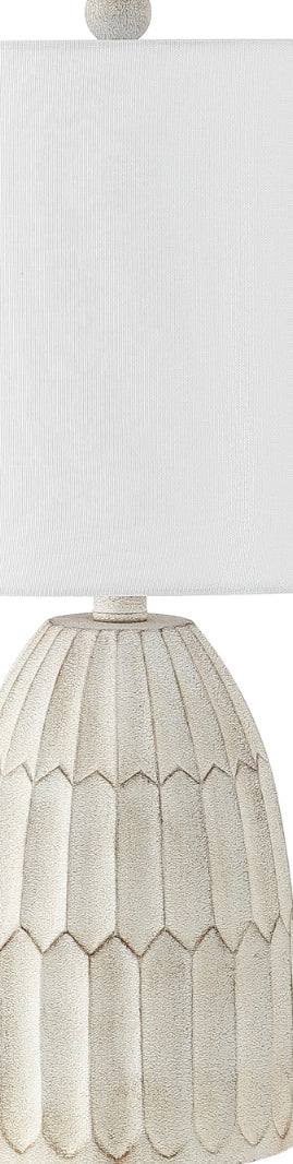 Taking inspiration from ancient architecture, this Ronken Table Lamp is a must-have for the well-traveled collector. Ronken showcases elegantly elongated textured hexagons over its statuesque white resin body with a weathered finish for an authentic vintage look.