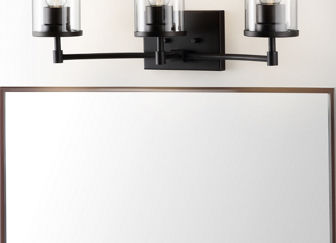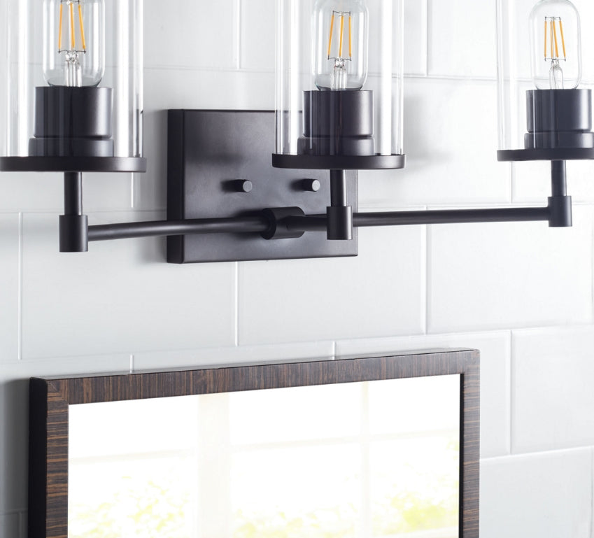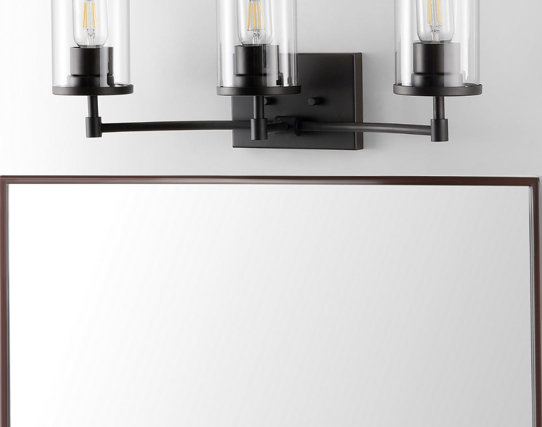 Upgrading the classic hurricane lamp for today's decor, this Ronsa Wall Sconce infuses Mid Century Modern flair into timelessly stylish forms. Three retro chic bubs are beautifully balanced by black oil rubbed bronze pedestals and housed by crystal clear glass, casting a glamorous shine in any room.