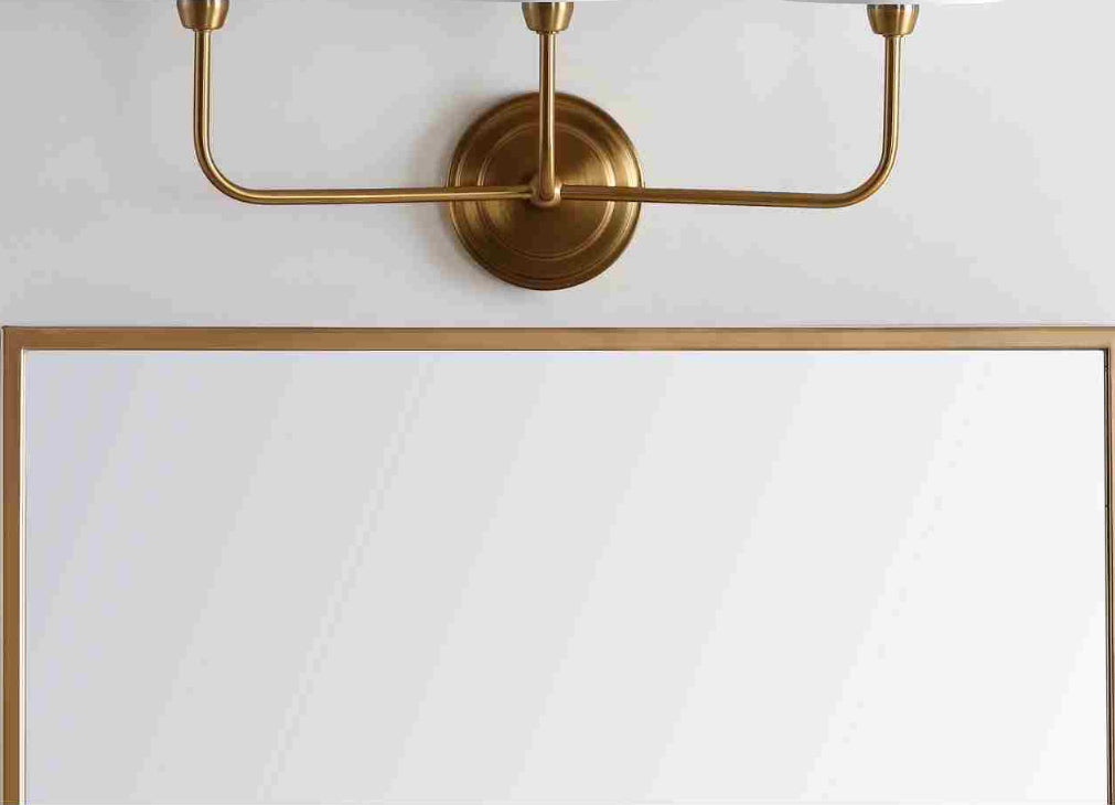 Designed to bring luxury to any living room or dining room, this elegant three light wall sconce boasts style and substance. Illuminated by ample lighting, its brass and gold finish shimmers alongside its off white cotton shades.