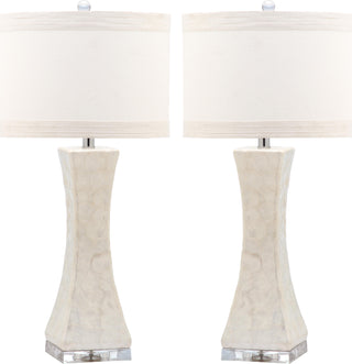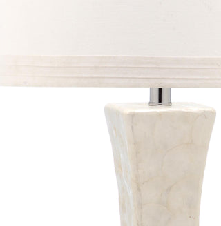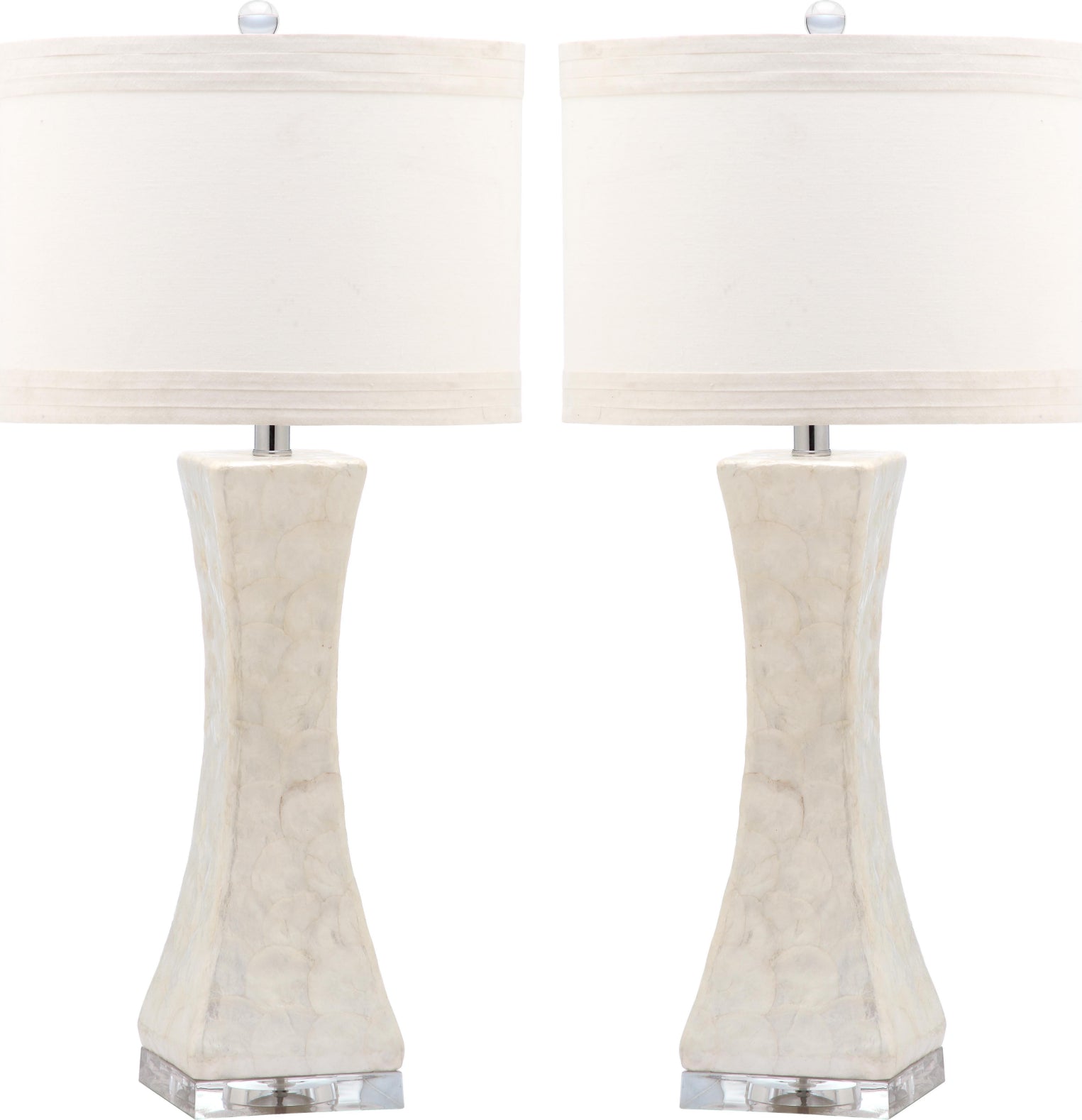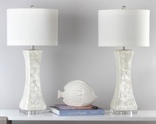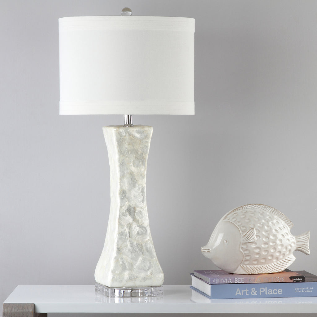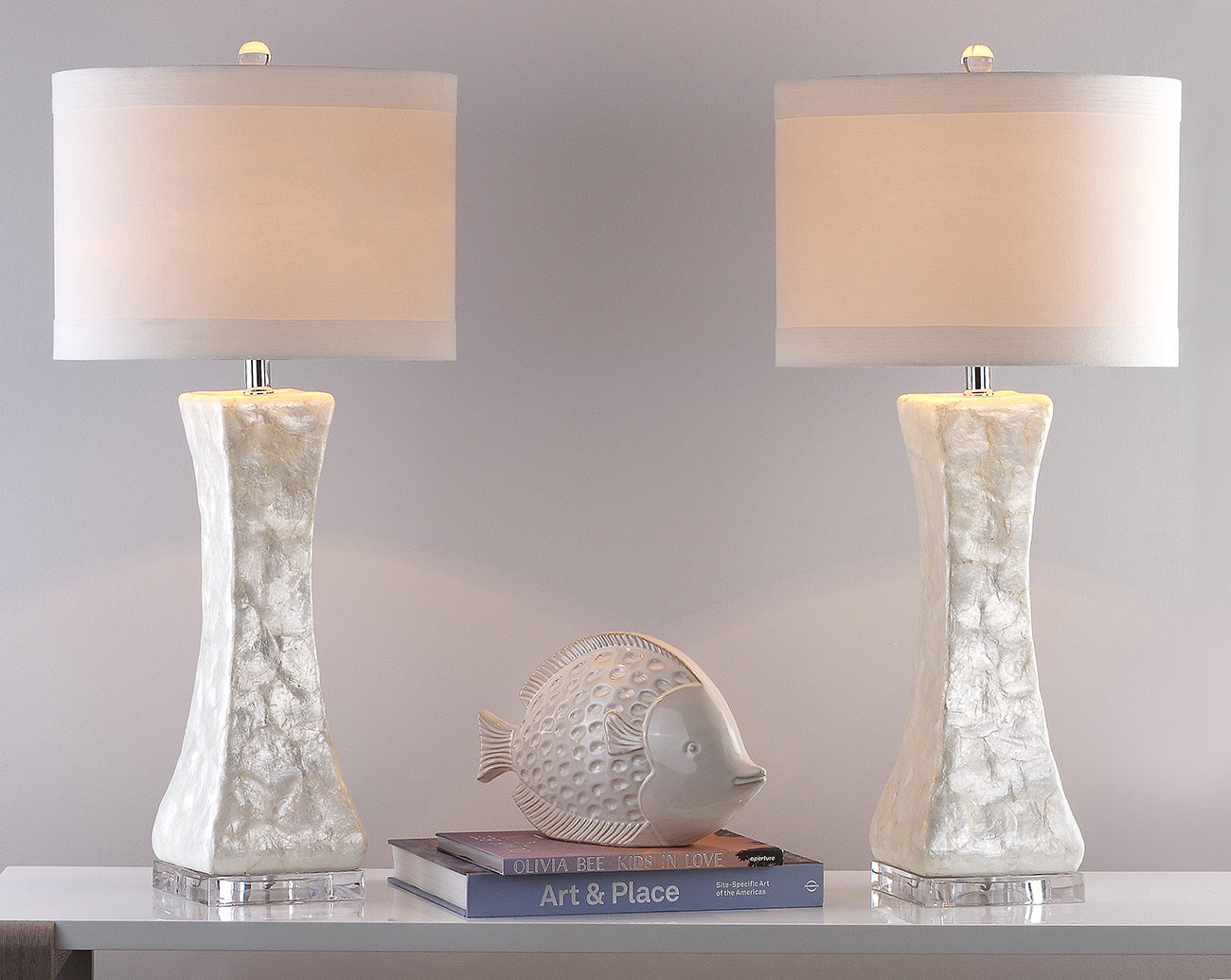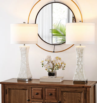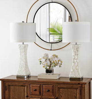 Cast a romantic glow in the living room or bedroom with this set of two white Shelley Concave Table Lamps. Capiz shell from mother of pearl oyster shells, silver chrome accents, and a clean white cotton shade give Shelley a rich, glamorous touch. Designers love Shelley's built-in USB port.