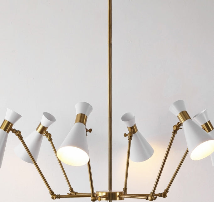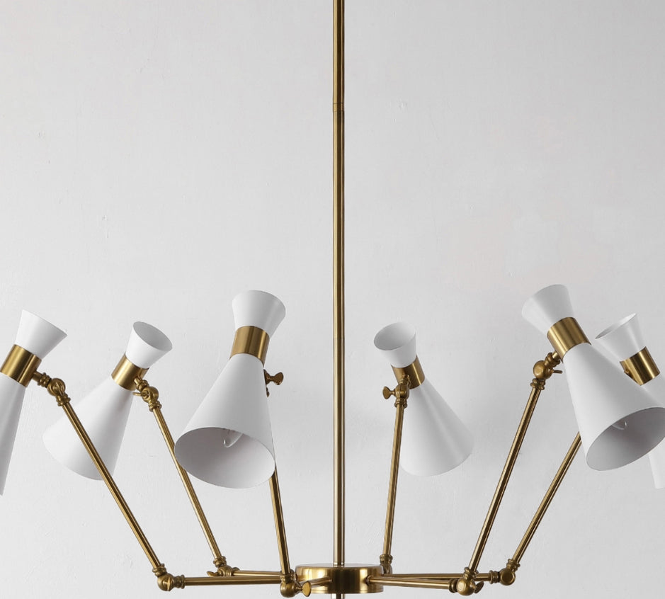 Illuminate your space with the sleek and stylish Shiraz Chandelier, an elegant fixture that blends functionality with design. This sophisticated centerpiece is crafted with a solid metal body finished in a classic brass, paired with crisp white shades that produce a warm, inviting glow. Its adjustable height feature provides versatility, making it suitable for both flat and sloped ceilings, thus ensuring a perfect fit in your dining area, living room, or foyer.
