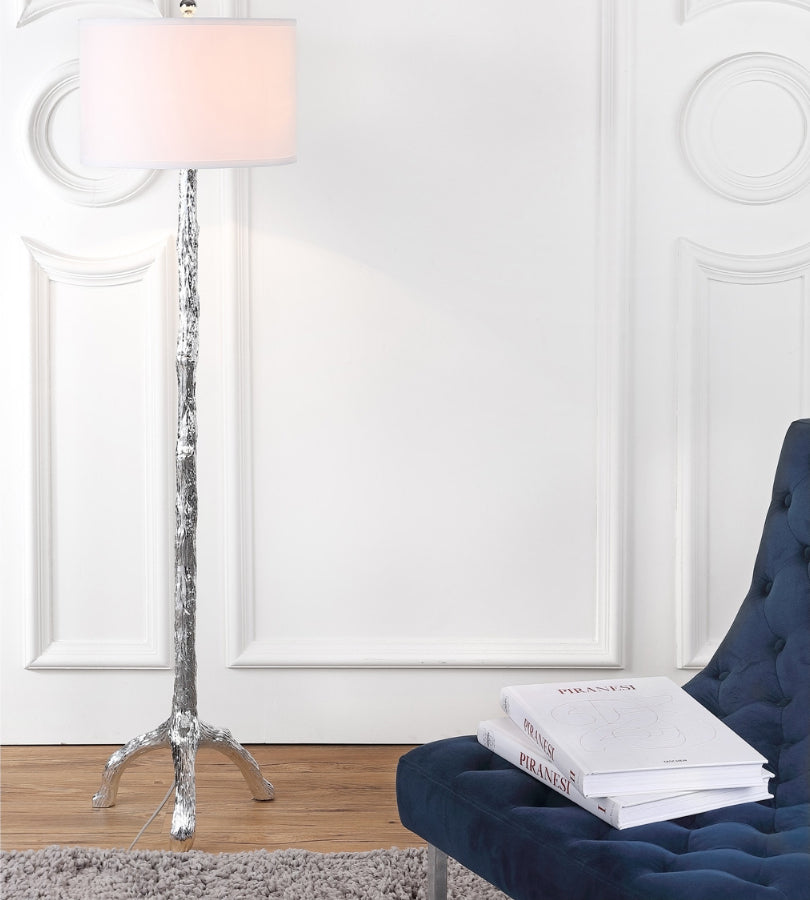 The sleek, sophisticated sculpted body of the Silver Branch Floor Lamp is a luxurious addition to any contemporary interior. Sculpted with silver painted resin and topped with a white cotton blend shade, its cosmopolitan charm makes this stylish light the focal point of any room.