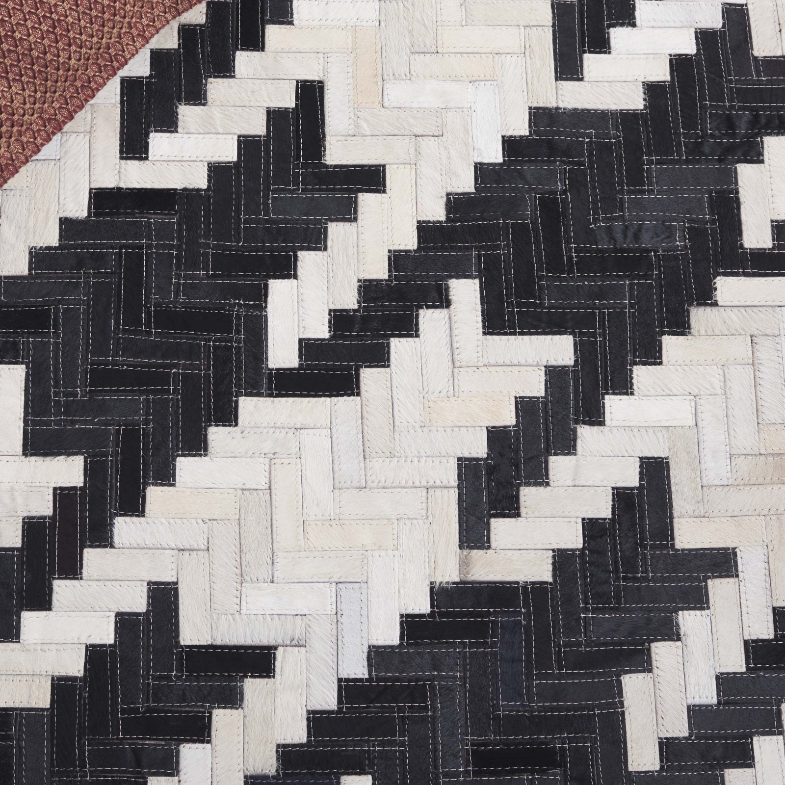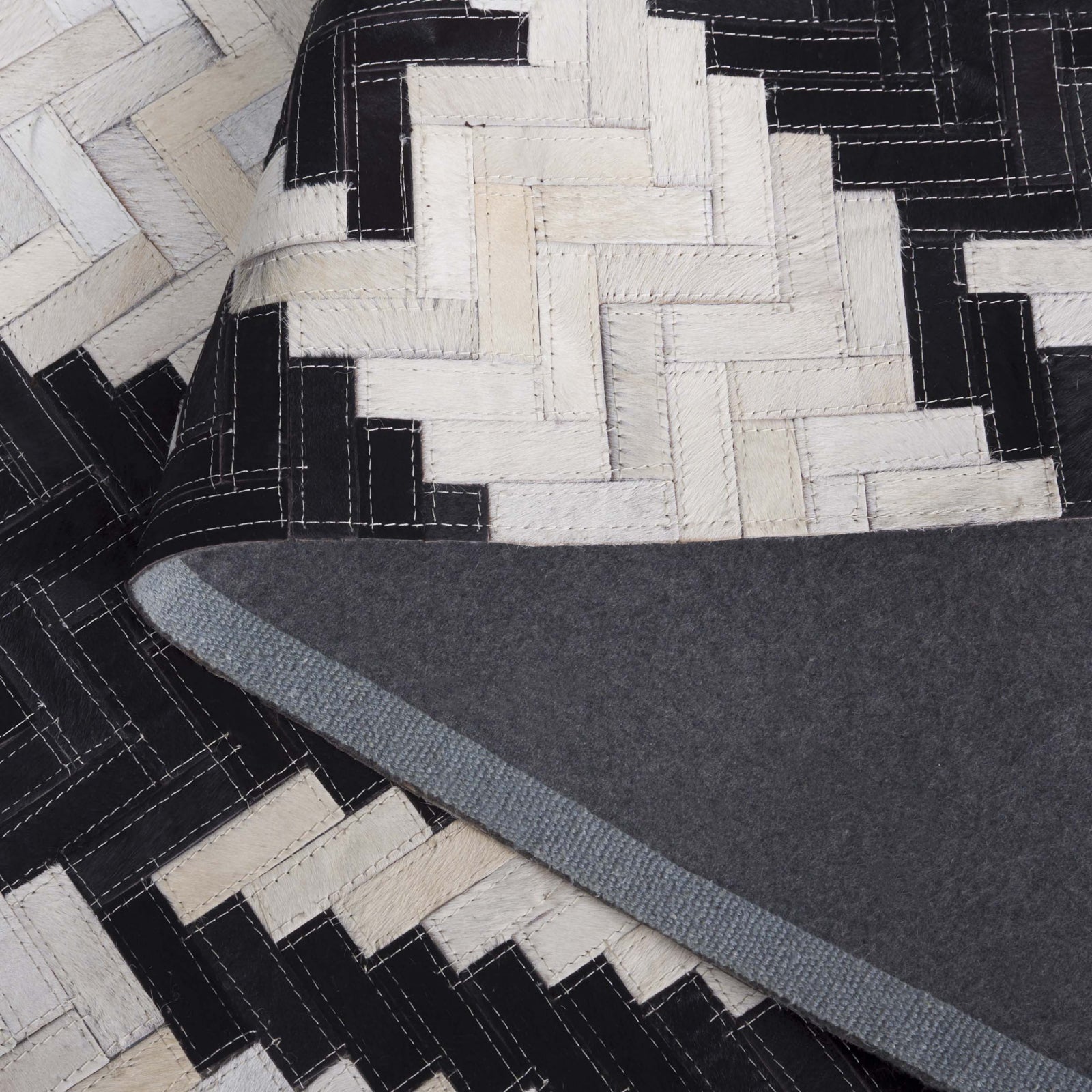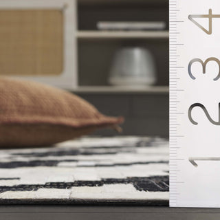 Indulge in the sophisticated design of this incredibly plush 2'3'' x 7' ivory and black runner area rug made passionately in India. Hand woven with exquisite craftsmanship, this stunning and unique piece is constructed from top-quality leather, giving it a rich and luxurious texture. The chic ivory and black color scheme is effortlessly refined, adding a dash of elegance to any living space. Plus, with a comfortable 1/4'' height, this runner rug beautifully defines your floor without being too bulky. Upgrade your home decor with this remarkable piece of art- it's not just a rug, it's a lifestyle statement.