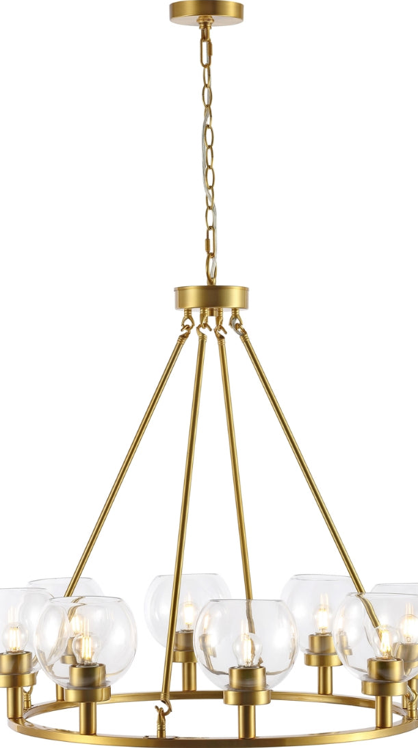 Give a sophisticated upgrade to any room with our stunning Sveda chandelier. Our refined and elegant, ring chandelier brings mid-century glamour to your home. A ring holds its gorgeous open spherical glass shades to make a stunning impact. Accented with brass, the chandelier adds polish and eye-catching style to any room. It includes eight lights to deliver a warm and radiant glow. Our chandelier can lend the perfect finishing touch to your entryway, living area, or dining space.