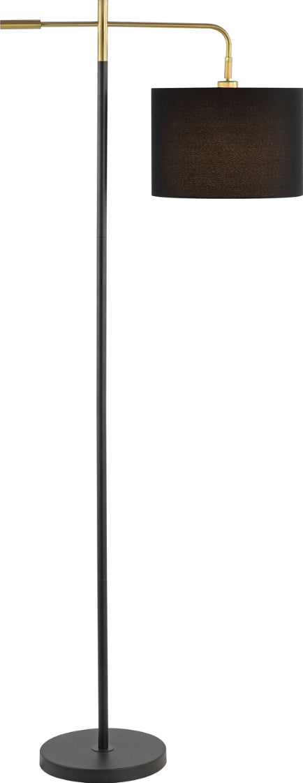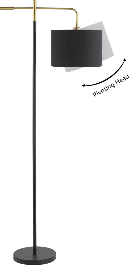 Step up any corner with the modern style and functionality of our Newbrook floor lamp. The clean and minimalistic design of our floor lamp lends practicality and effortless charm to any room. A slender stem and pivoting arm suspend a modern drum shade for a sleek and versatile appeal. Its black metallic body creates a beautiful counterpoint to its soft white fabric shade. With a pivoting arm and adjustable shade, our floor lamp helps in directing a soft glow to your desired area. It remains ideal for stylishly illuminating your sectional, sofa, or favorite armchair.