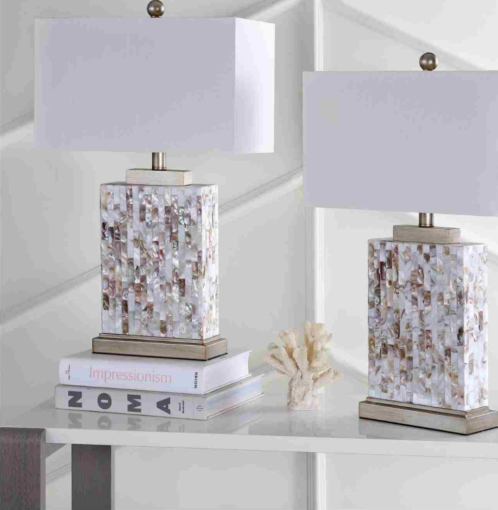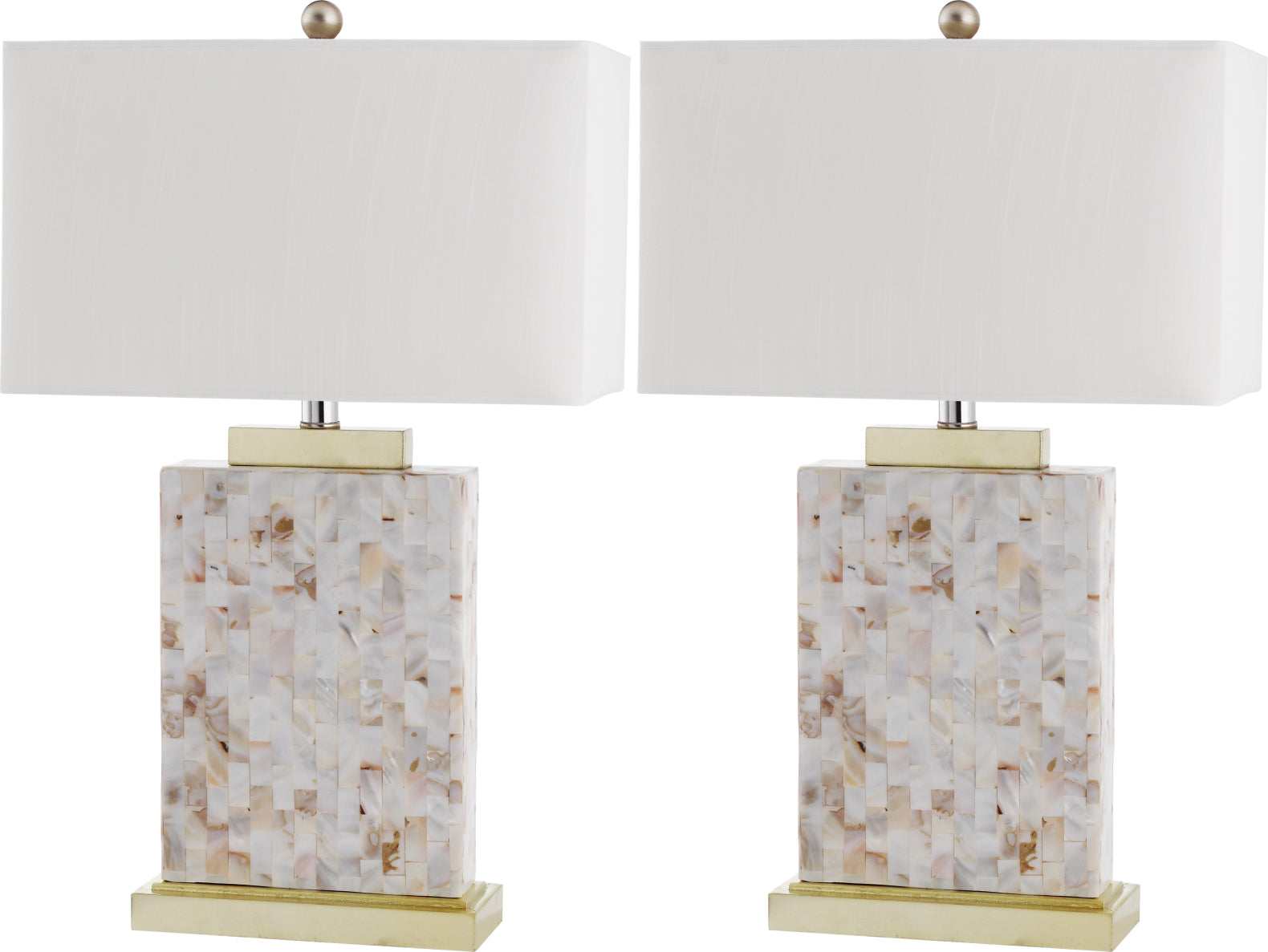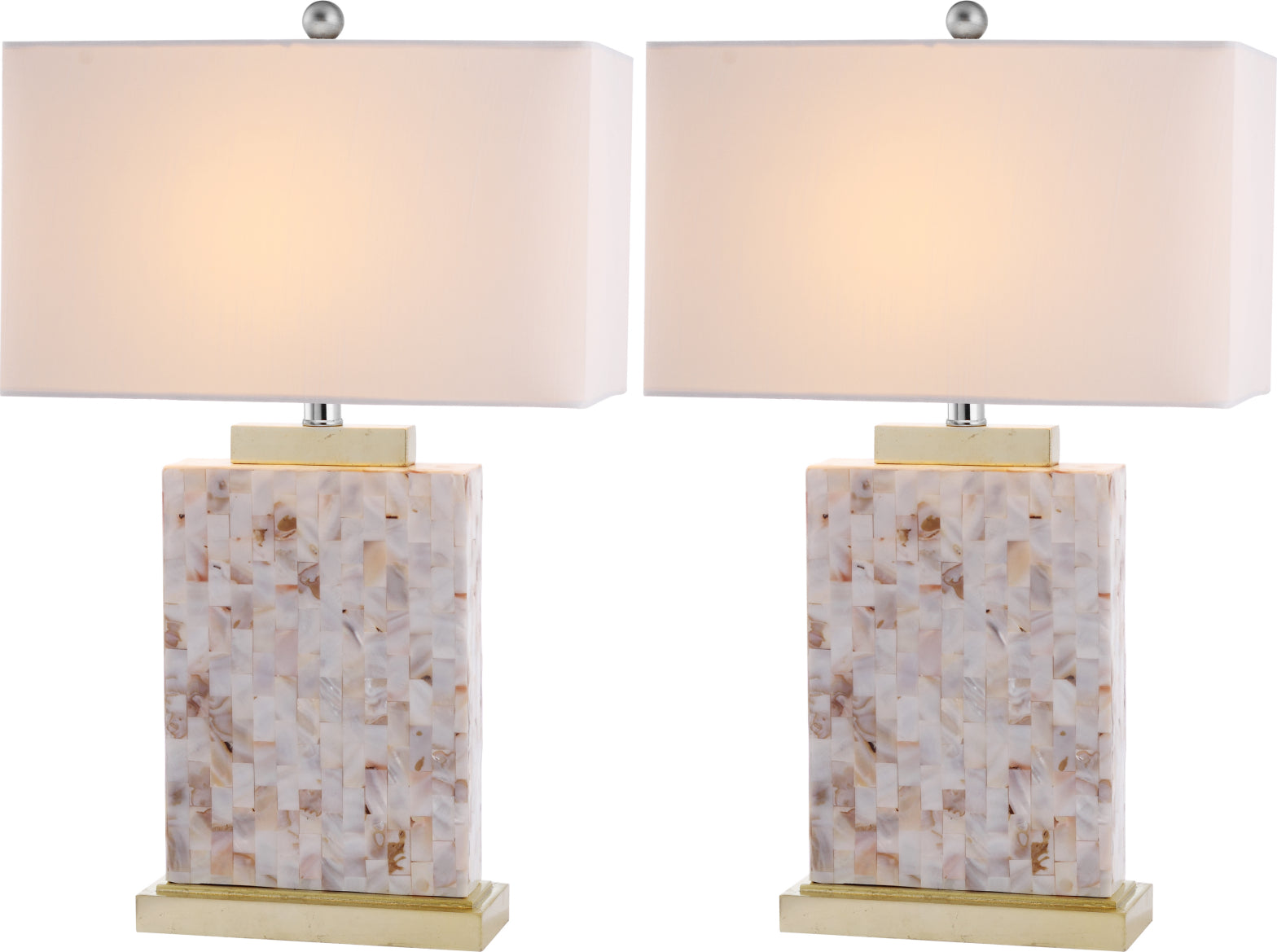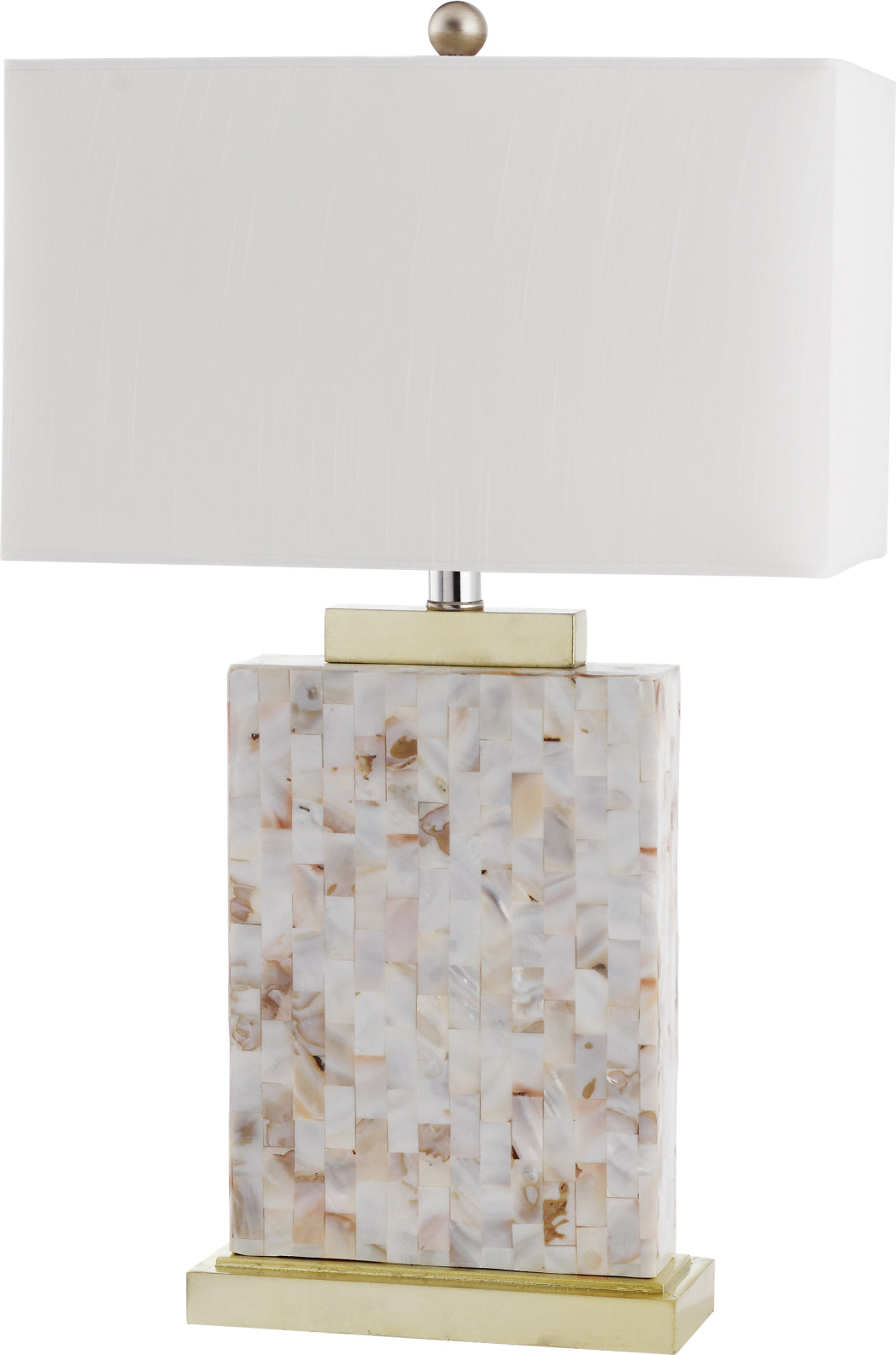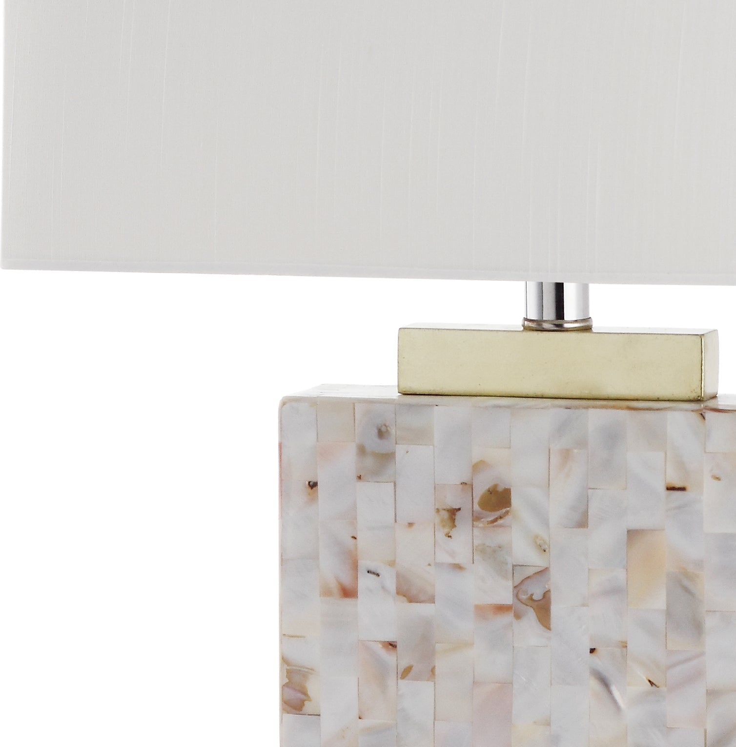 Architectural in its elegant simplicity, the Tory Table Lamp's columnar base is artfully adorned with a mosaic of capiz shells and complemented by a crisp white rectangular shade. With brushed gold stand and fittings, Tory casts an elegant glow in living room, hall, or bedroom. Sold in sets of two.