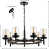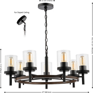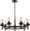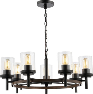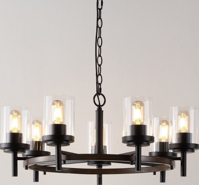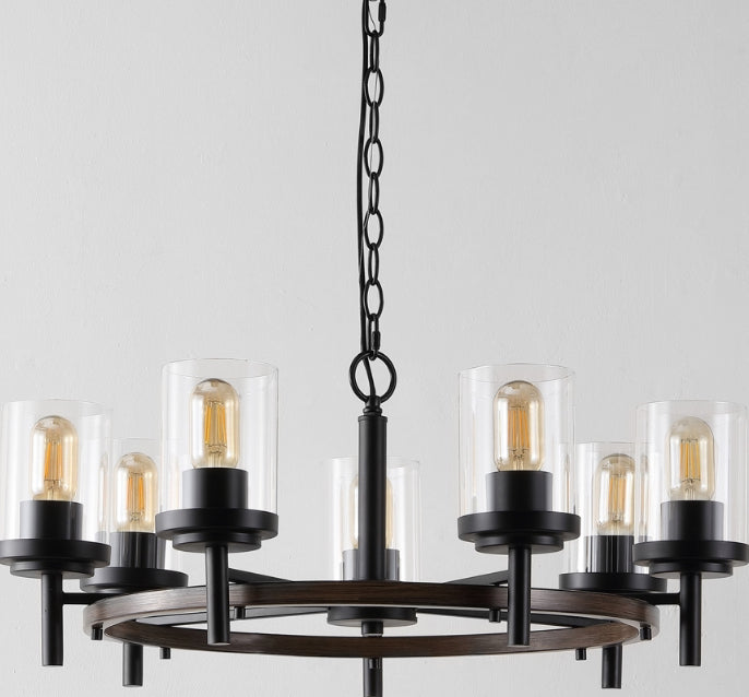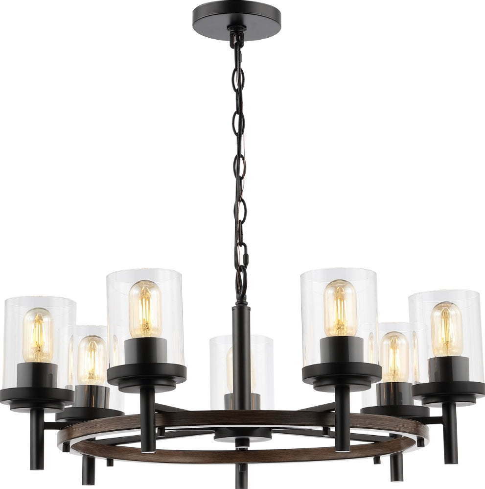 Elevate your home with the sleek elegance of our Vancouver chandelier. A perfect blend of modern and traditional sensibilities, our chandelier invites timeless charm to any room. Its streamlined design includes a metal ring that holds its sleek cylindrical glass shades. A beautifully complementing black and dark walnut finish adds definition and charm to our chandelier. It radiates a warm ambient glow to fill your entryway, living room, or dining space with a dose of warmth and elegance.