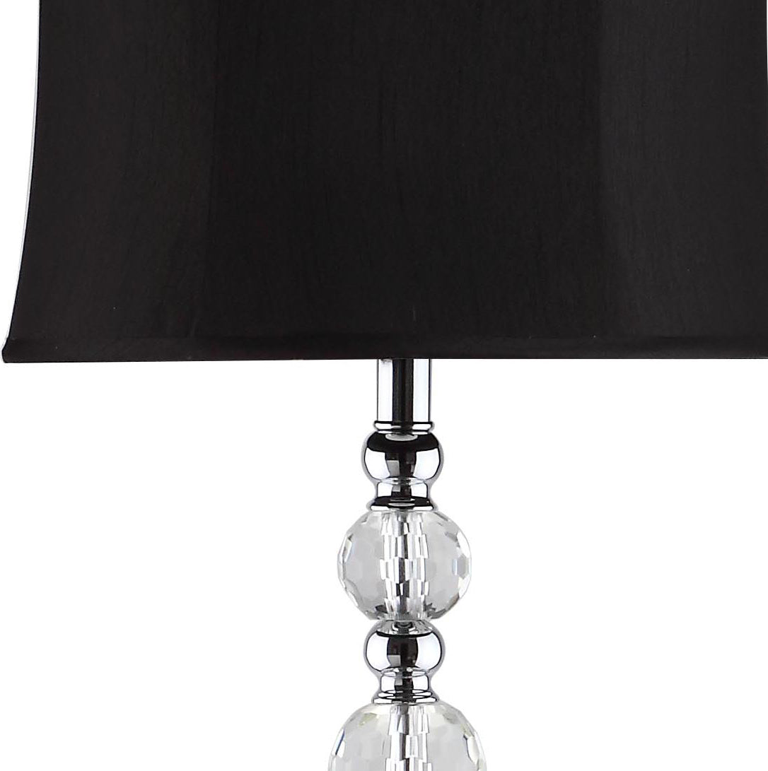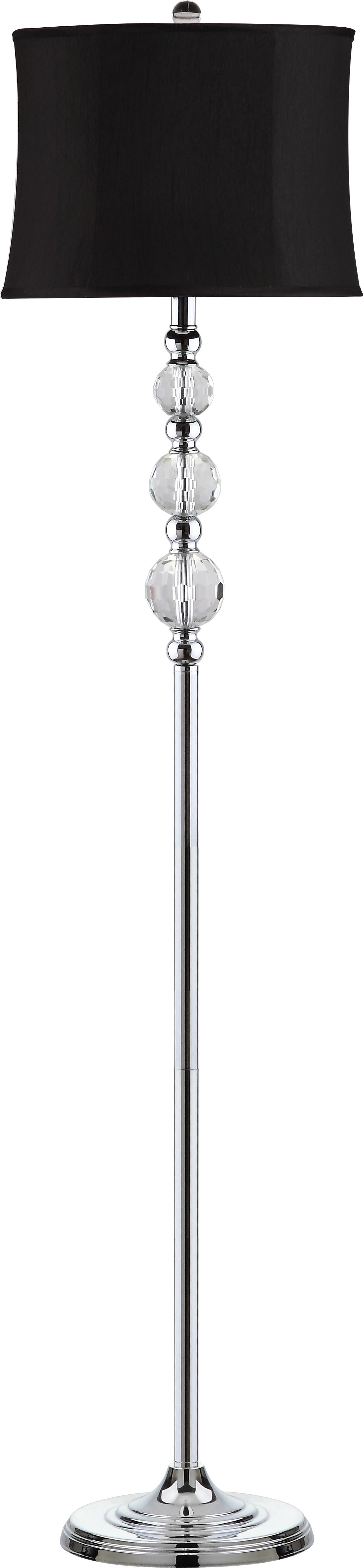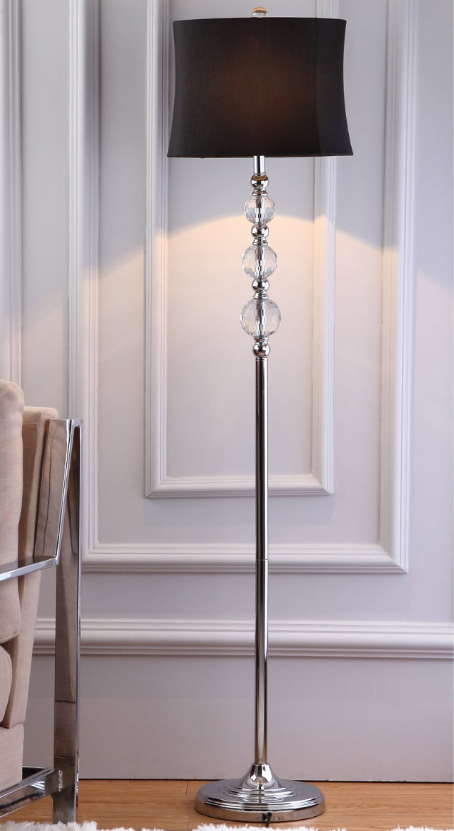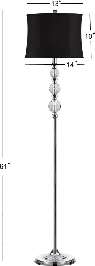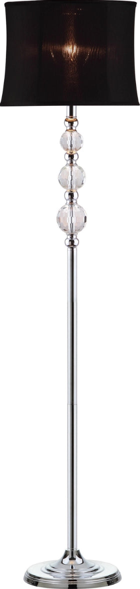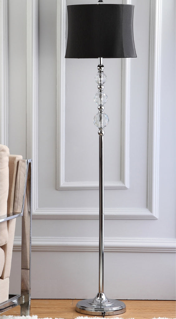 Simple details make the Venezia Floor Lamp a stand out. Carefully wrought crystal balls, recalling the renowned glass studios near Venice, and a black hourglass shade add a subtle feminine appeal, perfectly balanced with a sleek chrome candlestick base.