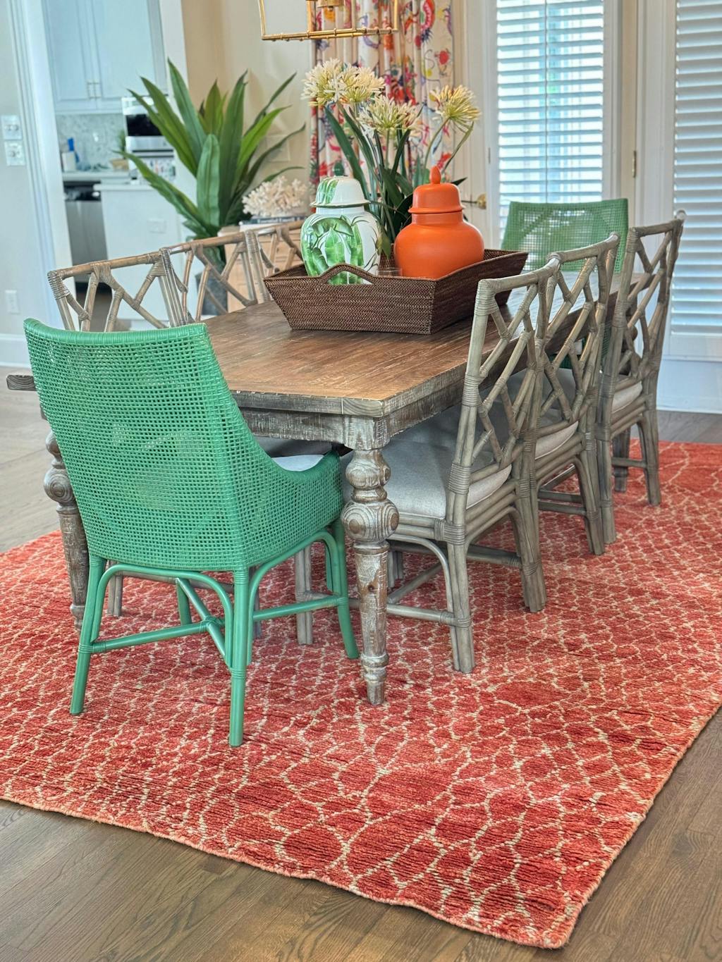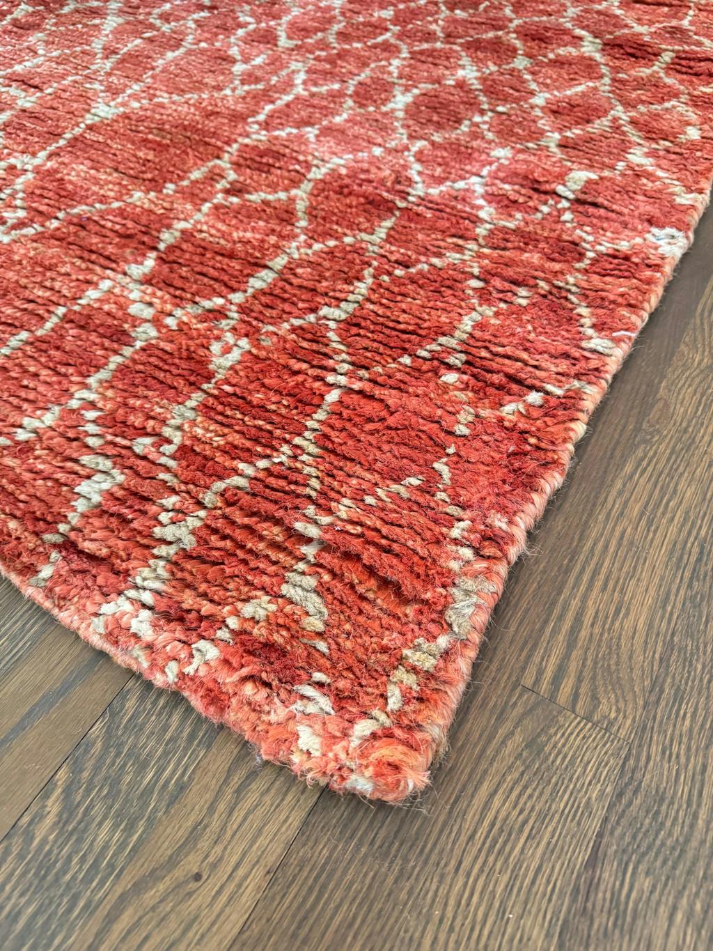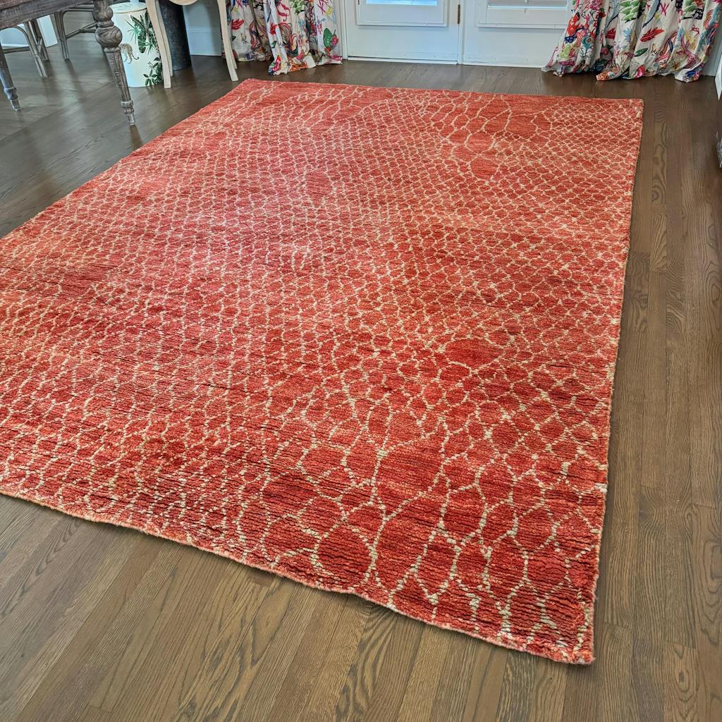 It is hard to find a true orange rug that is not rust or terra-cotta. This rug is more like a very dark coral orange, and it works in my space very well. It is softer than I thought it would be, very thick and cushy, and as a bonus, it laid flat right out of the package. I am pleased with my purchase!