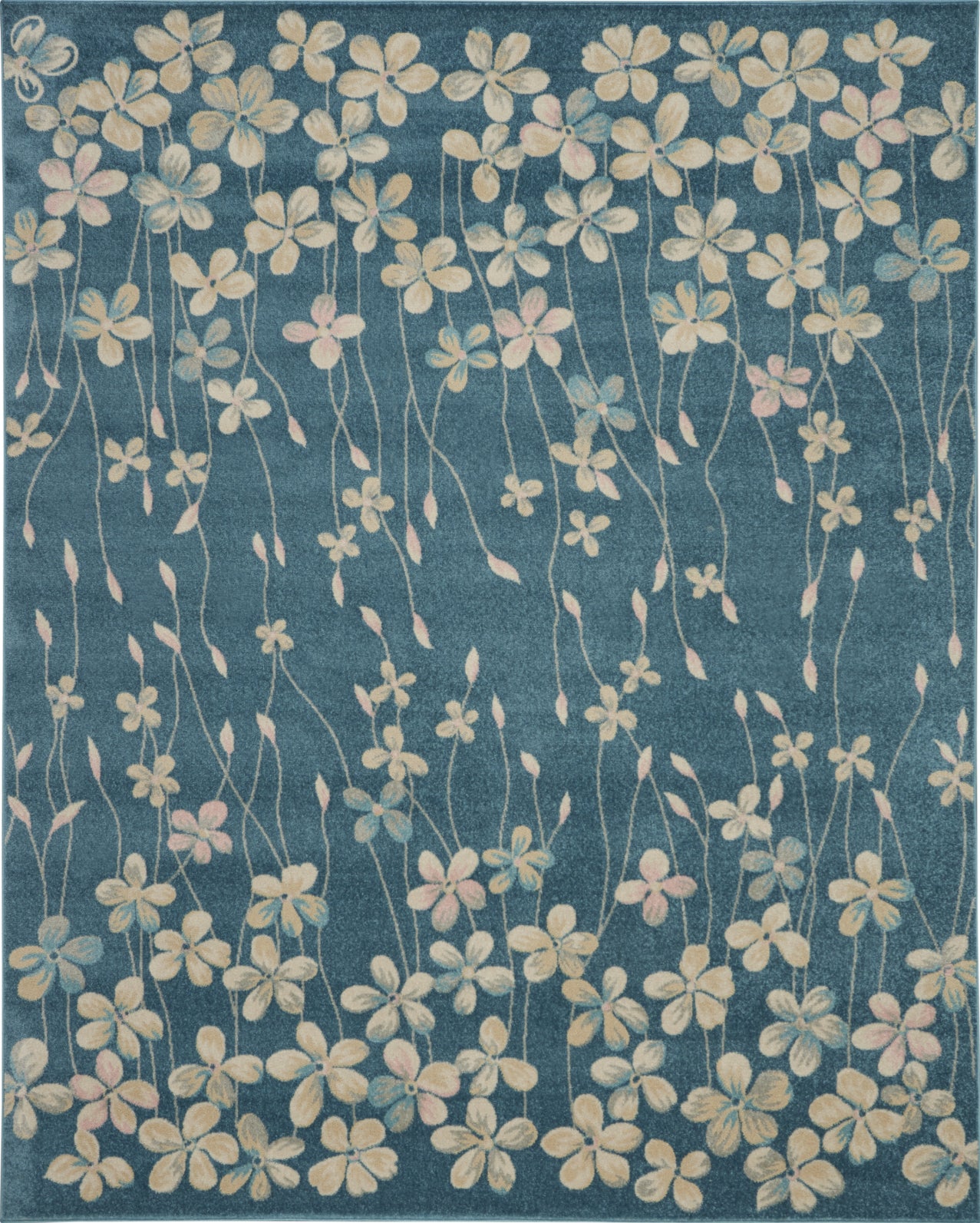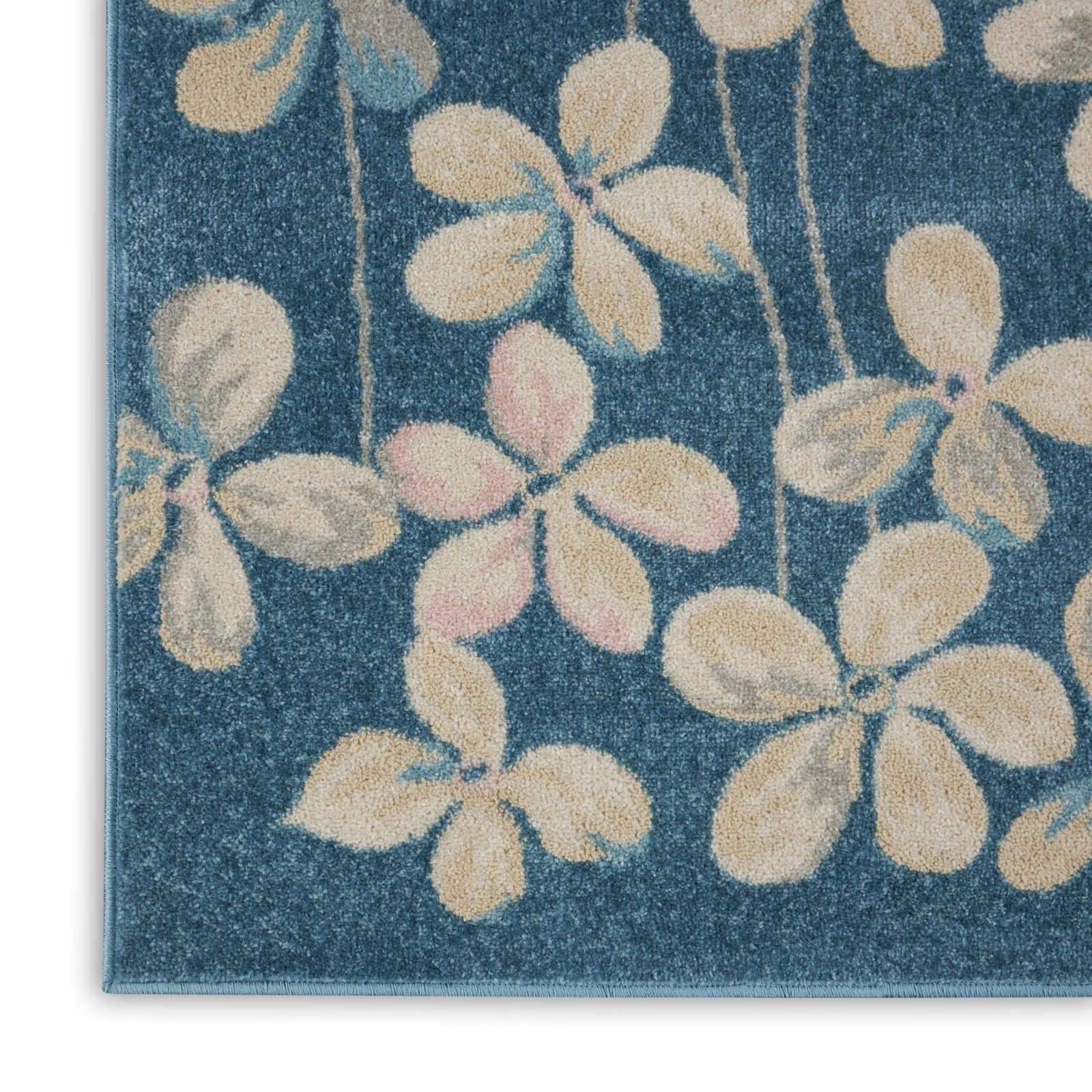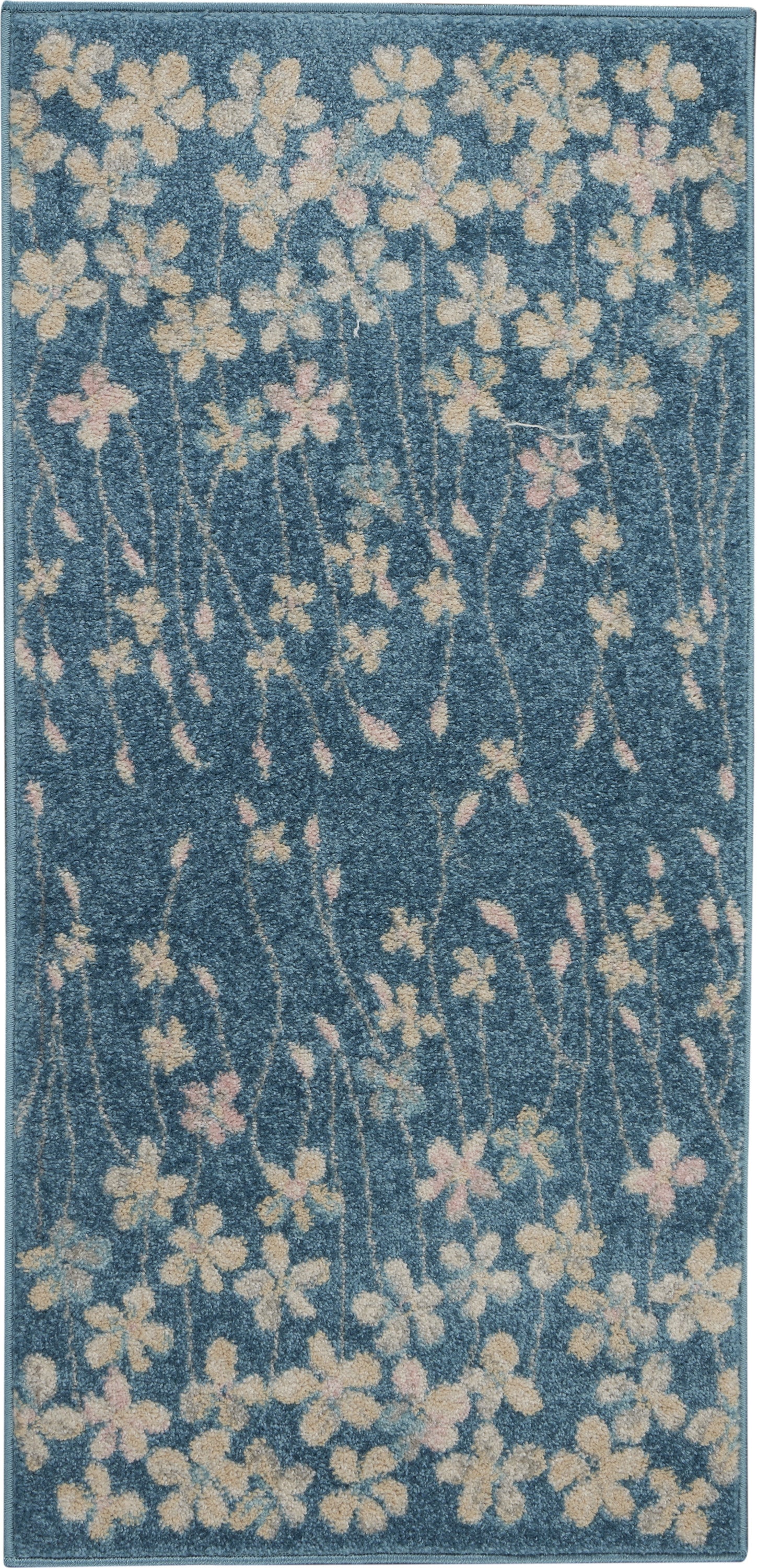 Nourison?s Tranquil Collection brings together a palette of soothing and elegant colors into an assortment of contemporary and traditional patterns, ranging from contemporary florals to intricate Persian and Kashan bordered medallion rugs. Each rug features a lush cut pile in easy-care fibers, with subtle abrash tones for touch of calming charm for any decor.. Delicate flowers blow on a gentle breeze in this delightful botanical rug from the Tranquil Collection. Watercolor tones of pink and blue on a blue field create a marvelous sense of softness to bring a boho look to your unique decorating style.