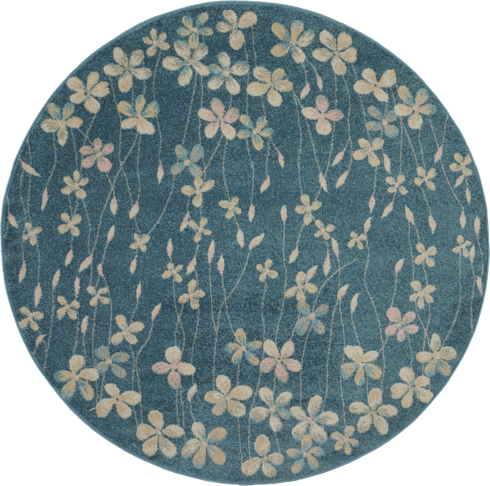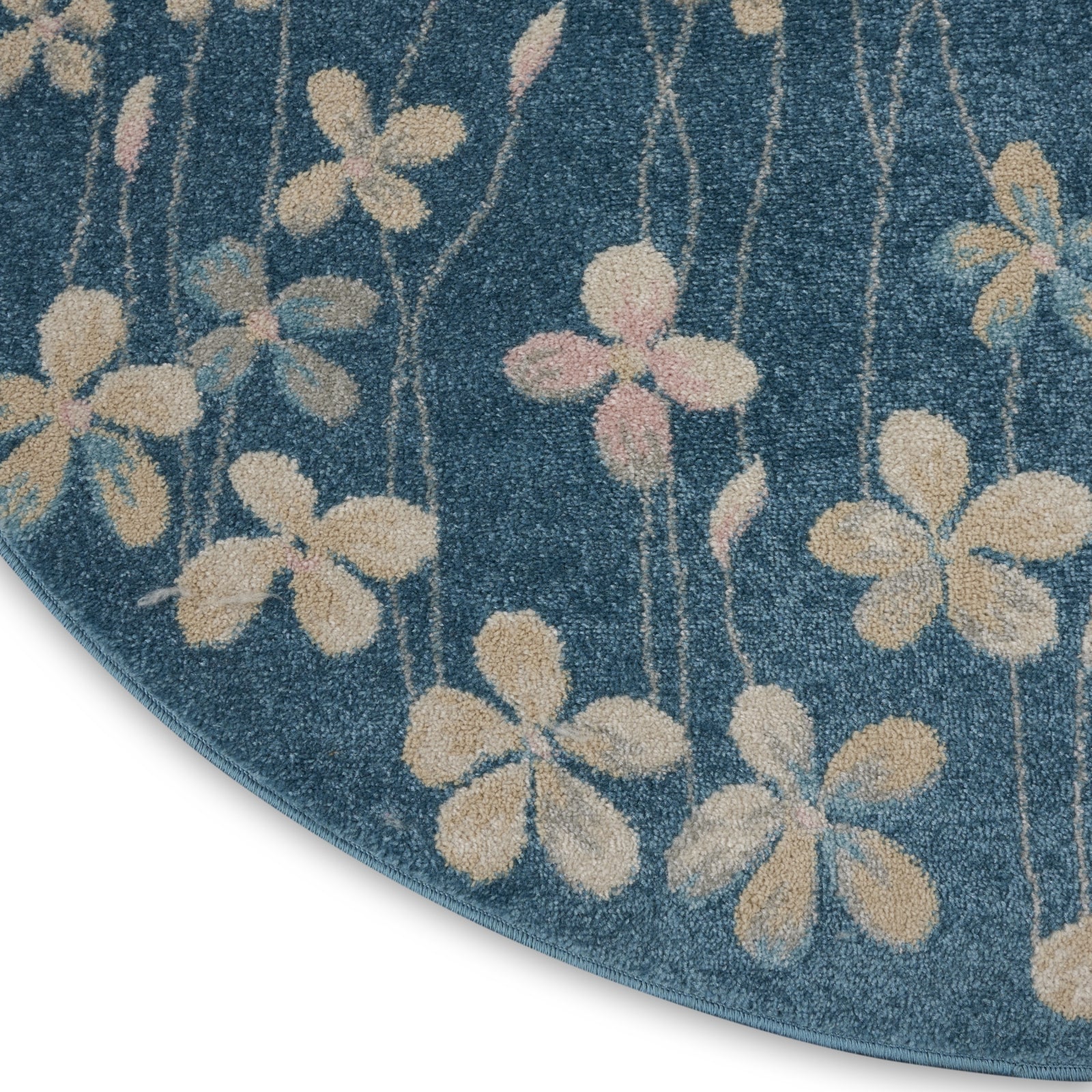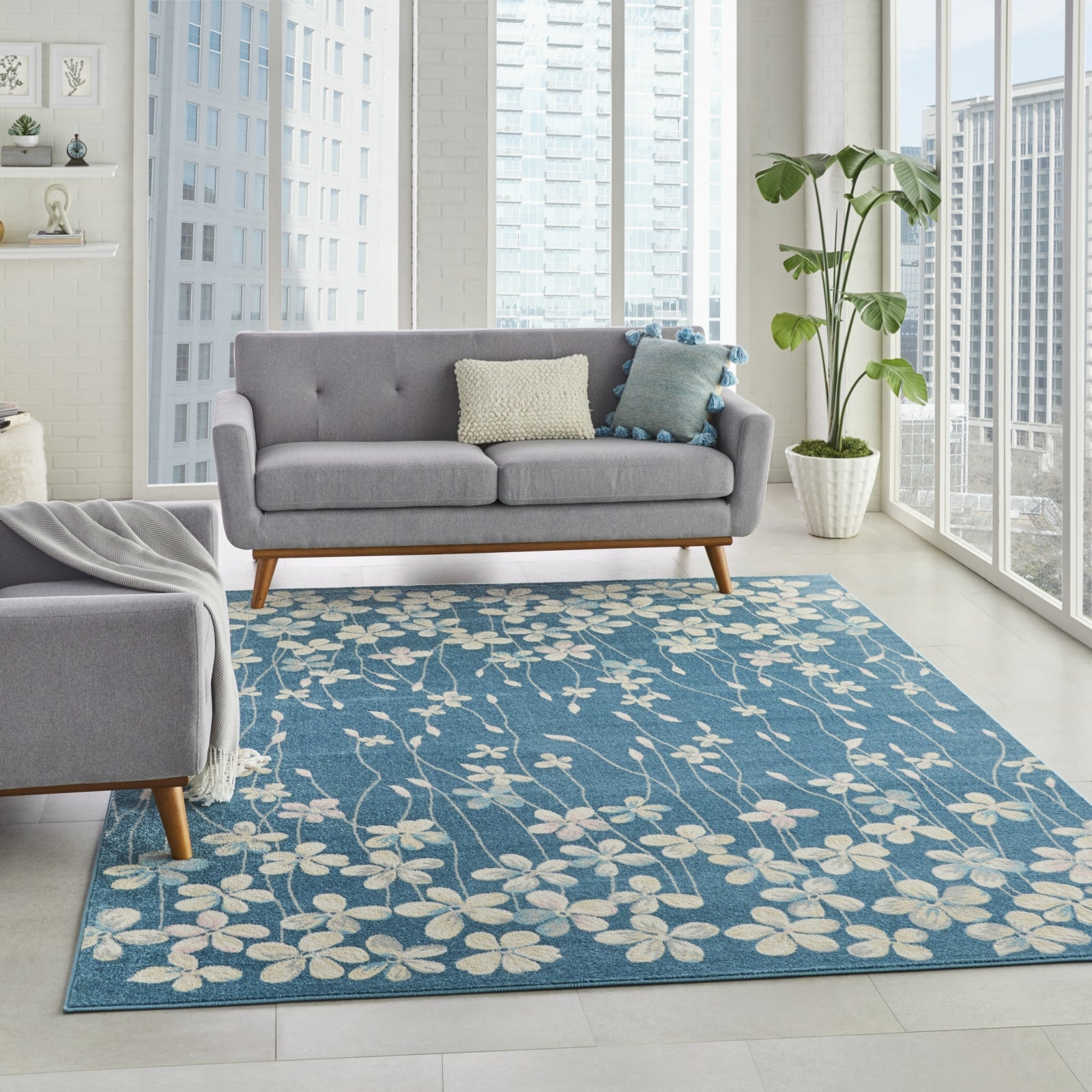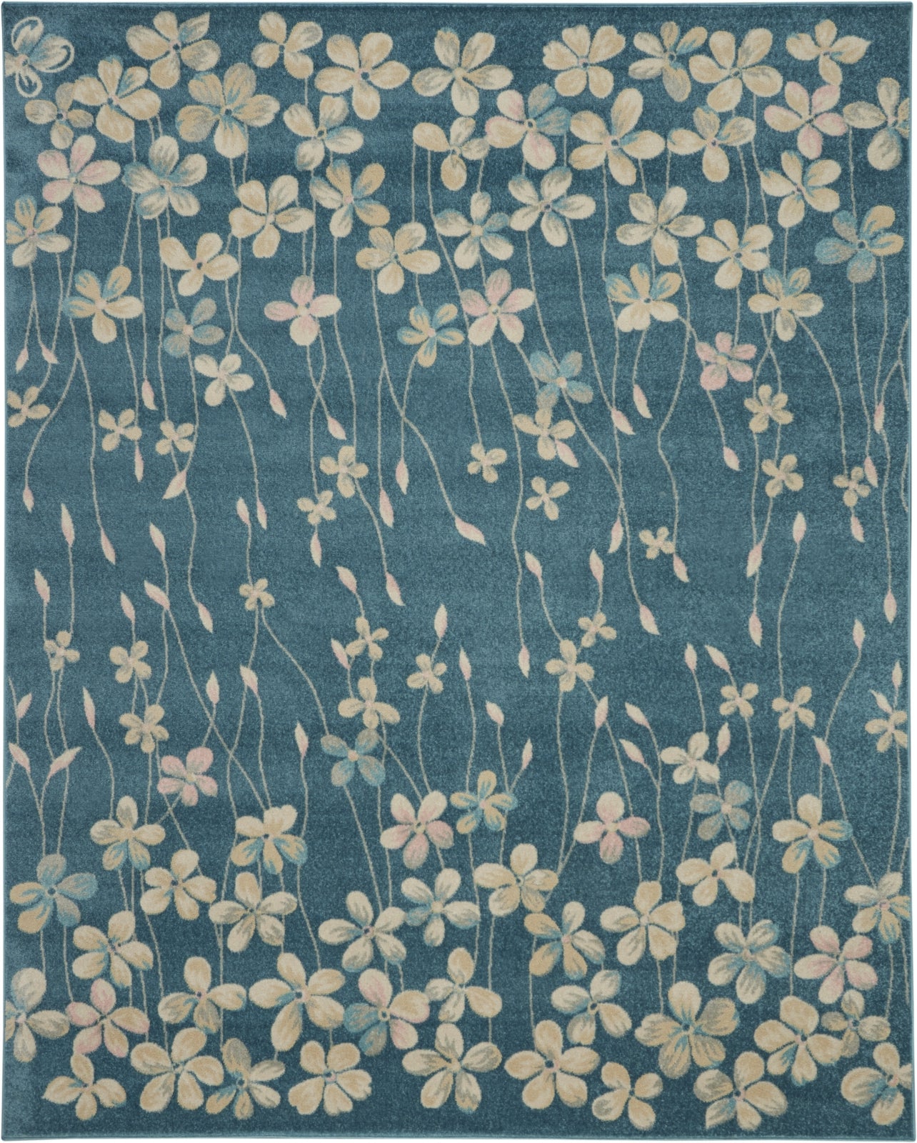 Nourison?s Tranquil Collection brings together a palette of soothing and elegant colors into an assortment of contemporary and traditional patterns, ranging from contemporary florals to intricate Persian and Kashan bordered medallion rugs. Each rug features a lush cut pile in easy-care fibers, with subtle abrash tones for touch of calming charm for any decor.. Delicate flowers blow on a gentle breeze in this delightful botanical rug from the Tranquil Collection. Watercolor tones of pink and blue on a blue field create a marvelous sense of softness to bring a boho look to your unique decorating style.