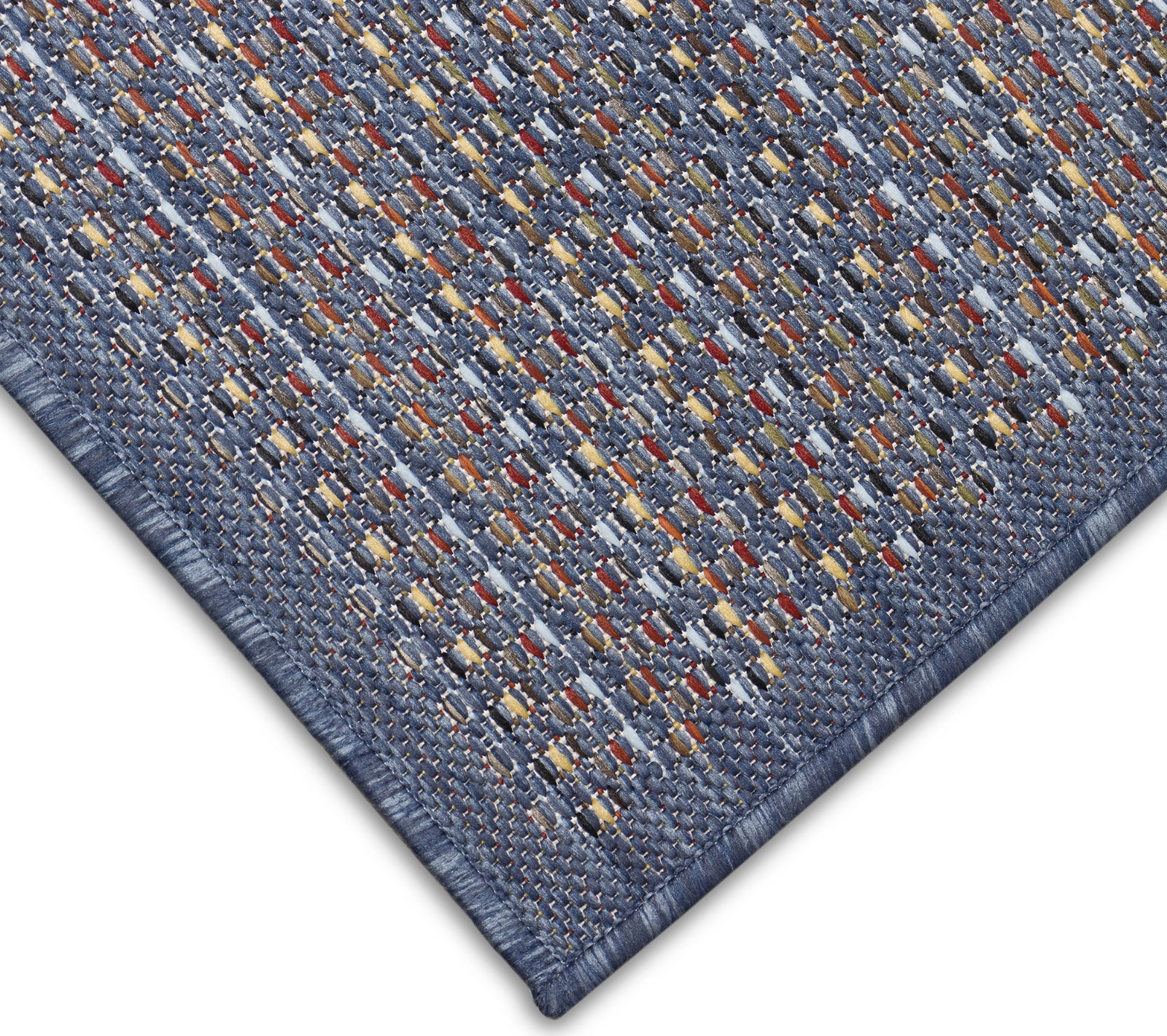This modern contemporary area rug features graphic lines and diamonds to create a subtle, yet dynamic design in denim and multi color accents. Made in Turkey from 100% polypropylene, the Avena Collection is Power Loomed to create subtle, naturally beautiful multi-toned detailed designs with sophisticated stitch definition and a high-quality finish. The material is flatwoven, fade resistant, durable and ideal for those high traffic areas such as your patio and living room making this the perfect indoor or outdoor rug. A fresh take on traditional area rugs, patterns range from contemporary and classic to seamlessly tie together the design of your home. Limiting exposure to rain, moisture and direct sun will prolong rug life.