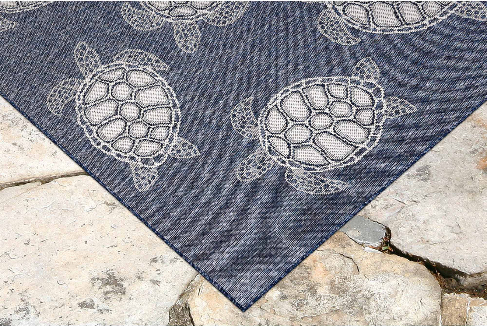 This simple, relaxed coastal design featuring lovely sea turtles in earth tones adds texture and warmth to any indoor or outdoor living space of the home, in navy. Wilton Woven of weather-resistant polypropylene, this flatwoven collection has subtle and natural beauty. There is no need to sacrifice style with these versatile rugs. The low-profile nature of Carmel offers a casual, lifestyle look to use nearly anywhere inside or outside the home.