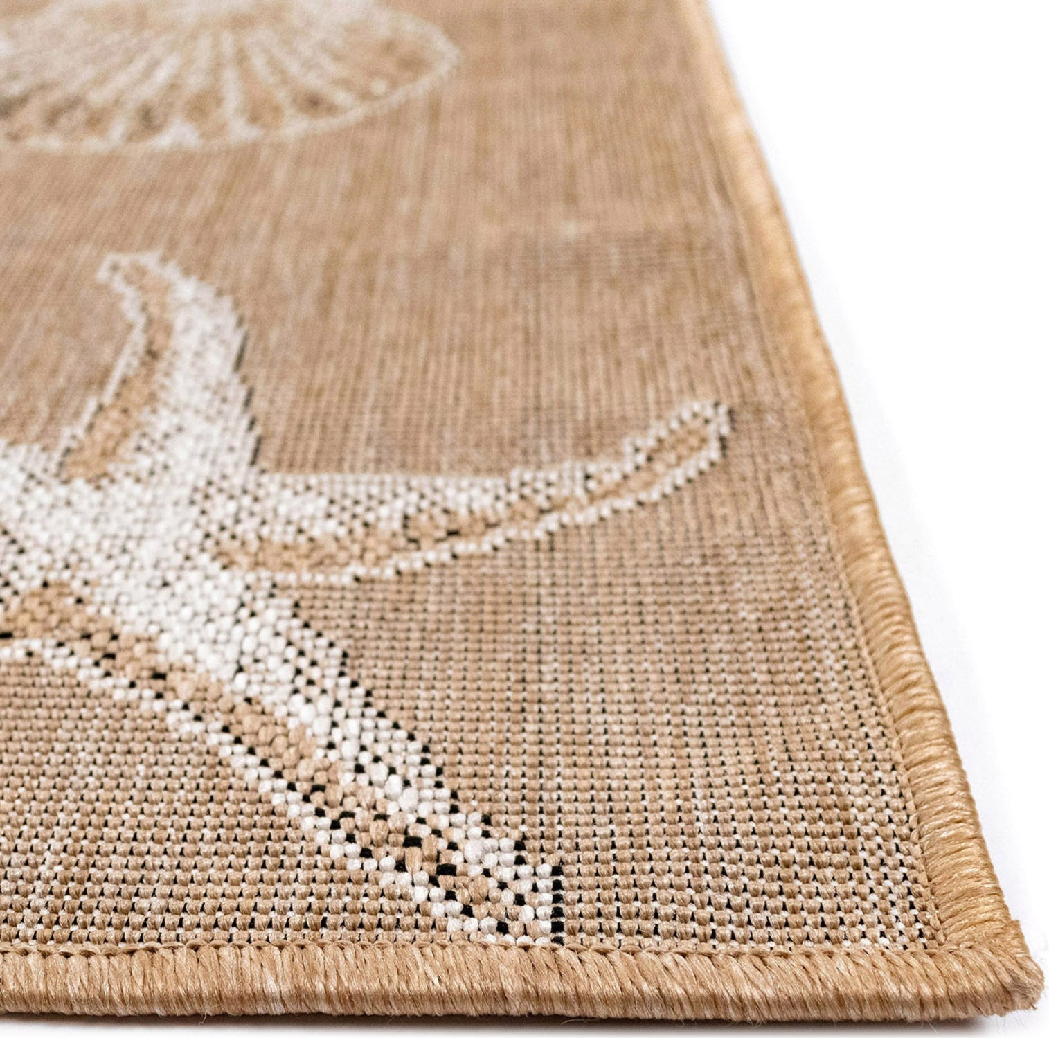 Add visual interest to your living space with this coastal-inspired rug featuring a variety of sea shells in a cool, crisp color palette, in natural. Wilton Woven of weather-resistant polypropylene, this flatwoven collection has subtle and natural beauty. There is no need to sacrifice style with these versatile rugs. The low-profile nature of Carmel offers a casual, lifestyle look to use nearly anywhere inside or outside the home.