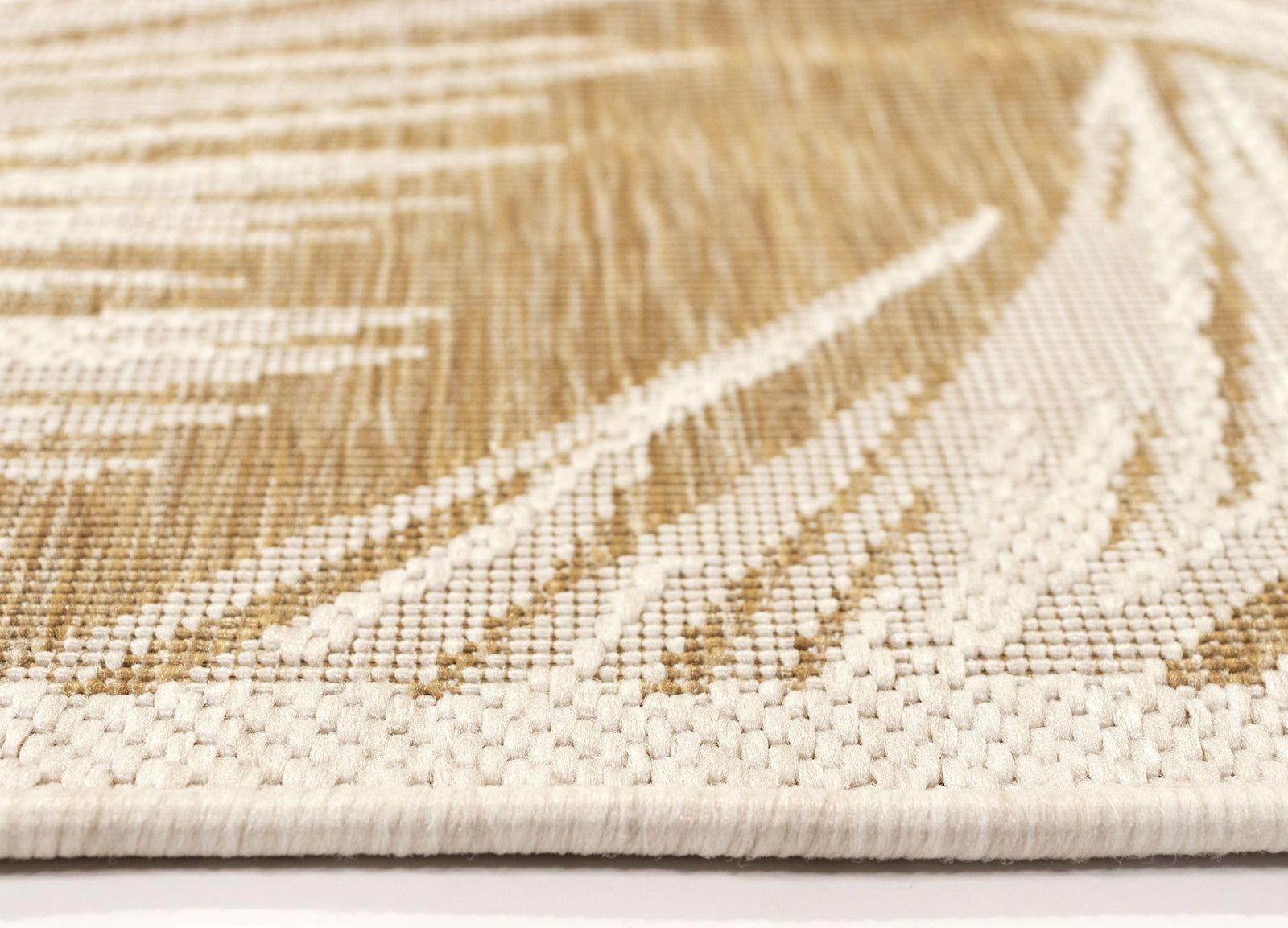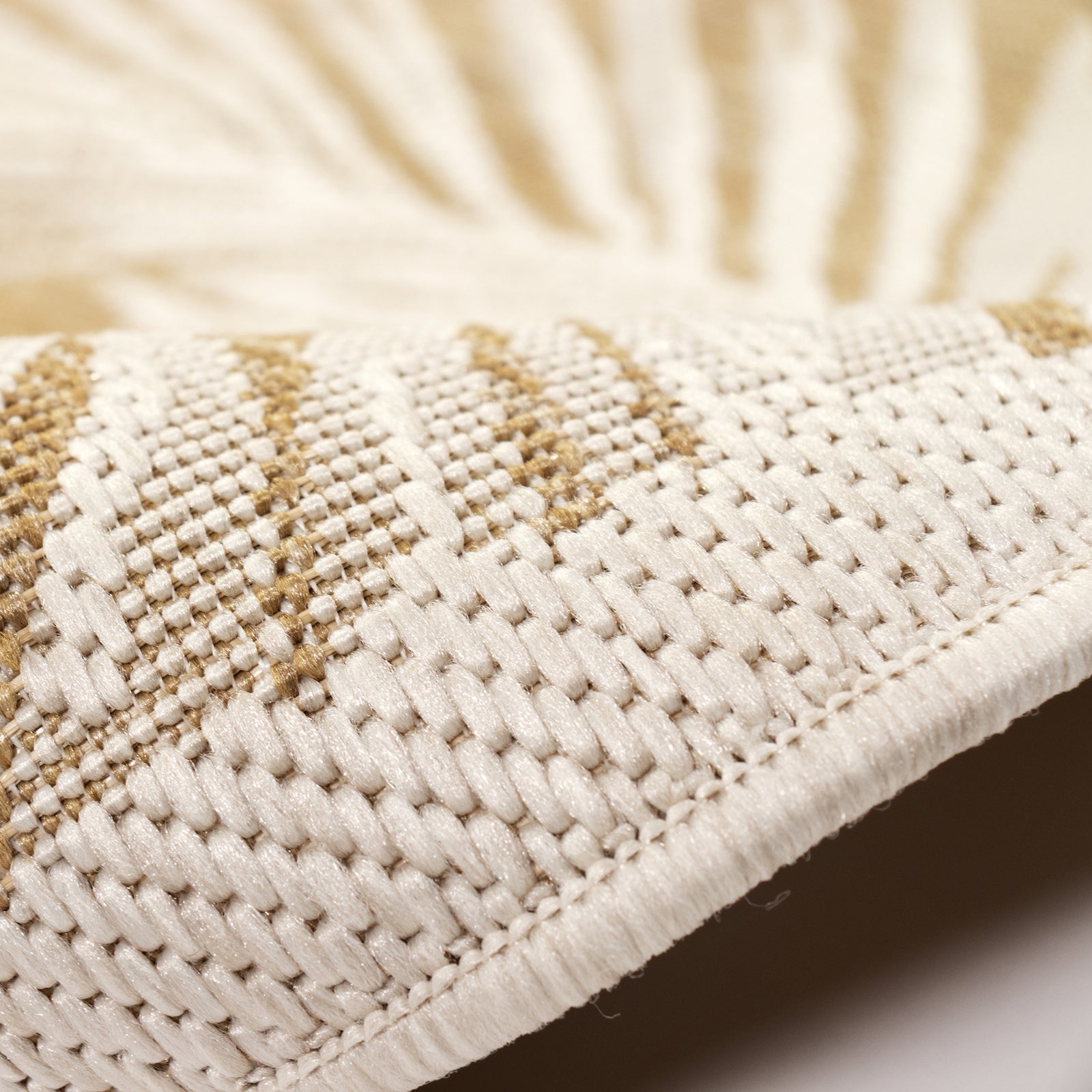 The details of the Fronds design of gentle palm trees create a tropical vibe to any decor for any room in the home, or outdoors on a patio, deck or sunroom, in beige. Wilton Woven of weather-resistant polypropylene, this flatwoven collection has subtle and natural beauty. There is no need to sacrifice style with these versatile rugs. The low-profile nature of Carmel offers a casual, lifestyle look to use nearly anywhere inside or outside the home.